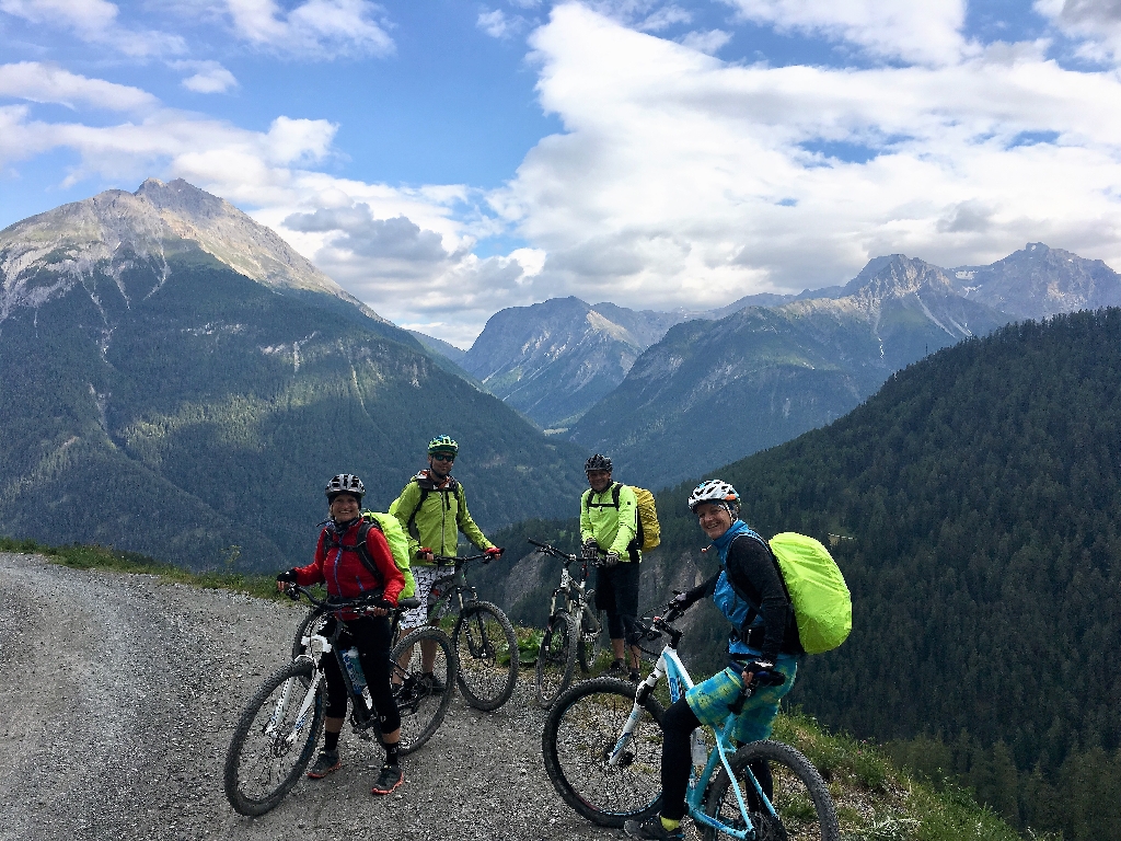 Abenteuer Uina Schlucht! Der Tag begrüßt uns mit strahlend blauem Himmel und wunderschönem Blick auf die umliegenden Berge! Endlich!!! Nach einem tollen Frühstück und dem täglichen Fahrradcheck geht’s gegen 8.45 Uhr ein ganzes Stück in Serpentinen runter nach Sur‘En. Am Campingplatz dort stößt noch ein Kollege dazu, um mit uns durch die Schlucht zu radeln. 1200 Höhenmeter liegen vor uns.