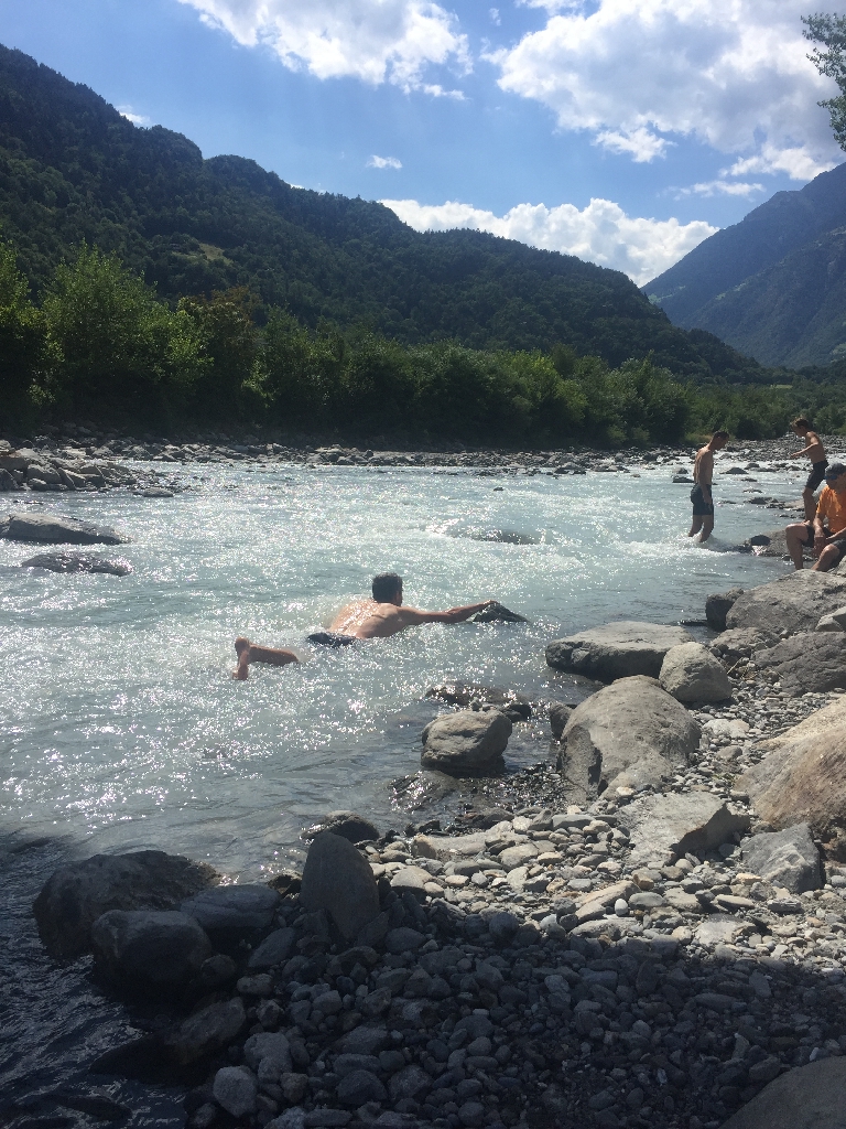 Am Nachmittag kurz mal an der Etsch gehalten und die Füße (manche auch mehr) ins kühle Nass gestreckt! Sehr prickelnd – es hat an die 35 Grad!