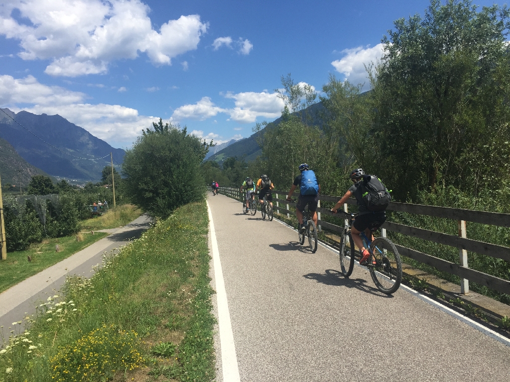Nach einem ausgiebigen Frühstück auf der Terrasse mit Blick ins Tal rollen wir den Radweg nach Süden, Richtung Meran, an der Etsch entlang, mit vielen Päuschen, um Cappuccino oder Limo zu trinken.