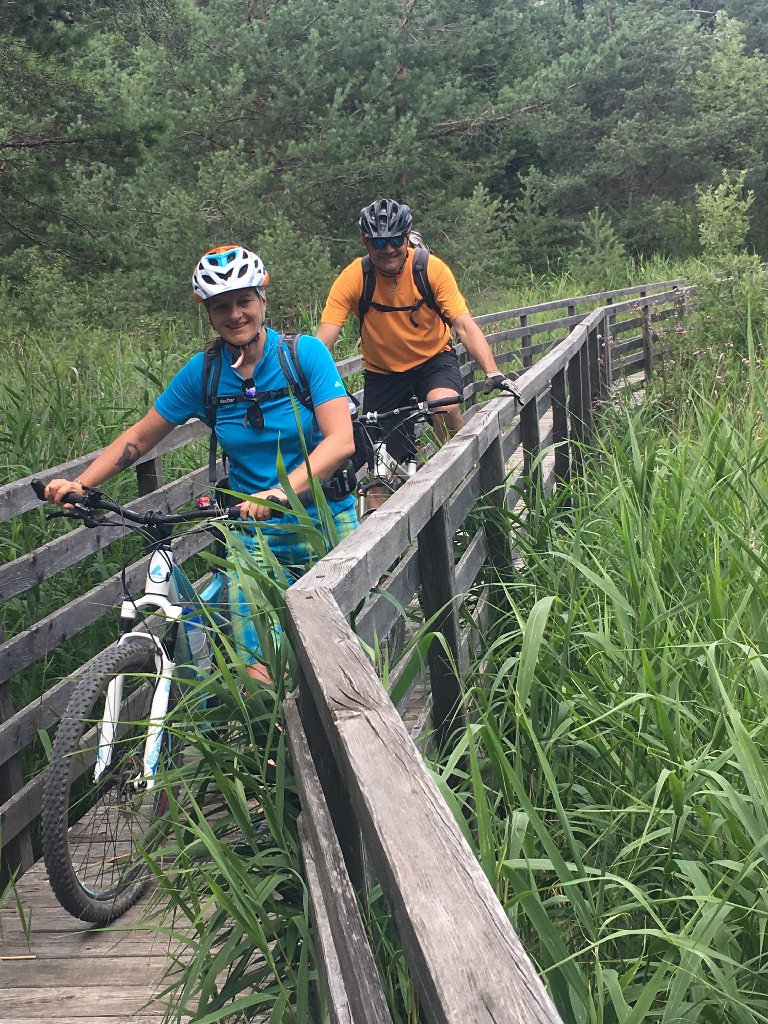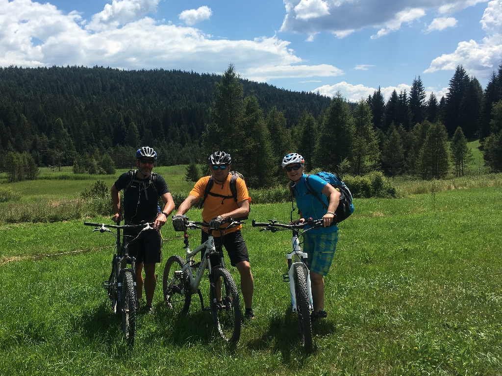 Danach muss leider einer unserer Gruppe nach Hause zurückfahren und so bestreiten wir den Rest der Tour zu viert. Nach einer Getränkepause am Pass geht’s über einen tollen Waldweg mit Stopp an einer Pilgerkirche zum schönen Rifugio Arnika, einer Trattoria mitten im Wald. Der ideale Ort für unsere Mittagspause. Anschließend weiter durch den Wald, schön zu fahren, stetig bergauf und bergab, und kaum jemand unterwegs.