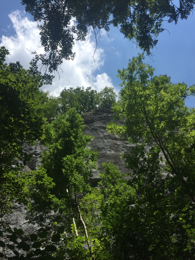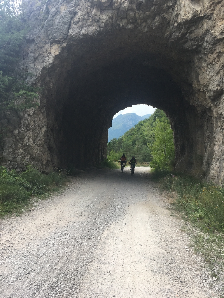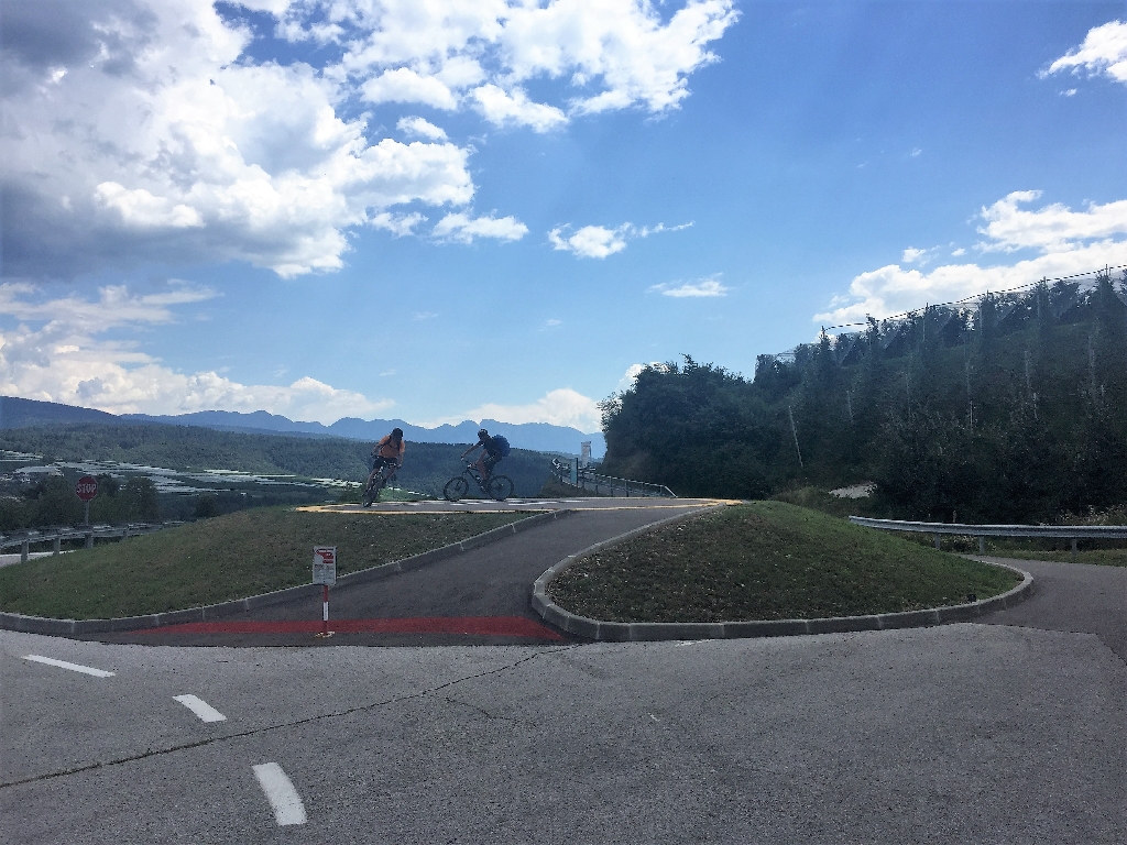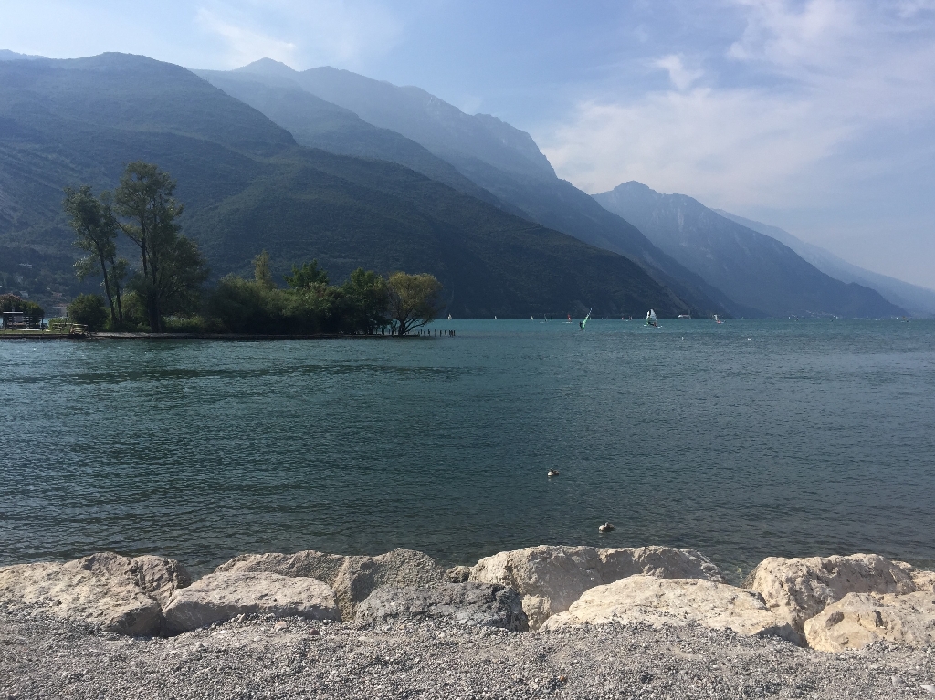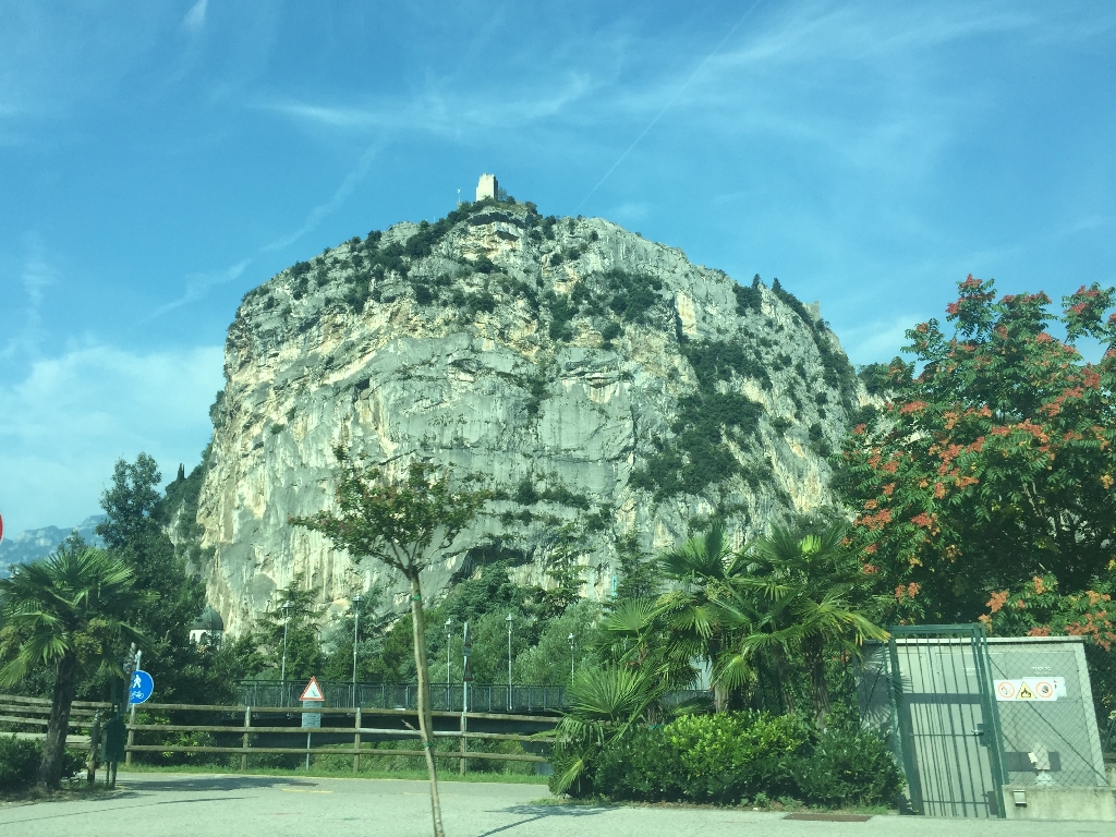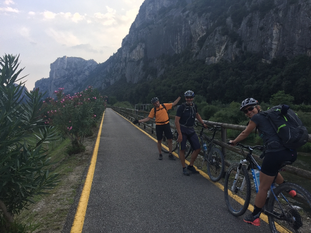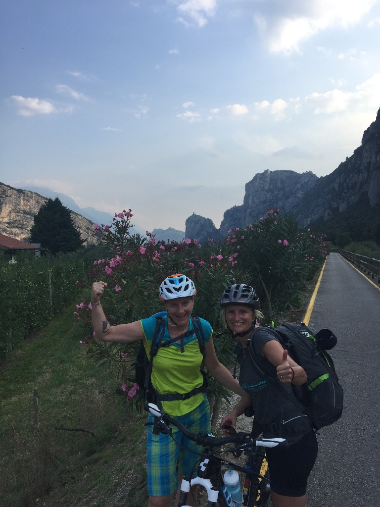 Nach einer Kaffeepause in Ranzo wollen die Jungs einen Downhill Trail machen, und wir Mädels eine alternative Strecke auf der Straße radeln. Nach ca. 2 km müssen wir aber umdrehen, da die Straße plötzlich gesperrt ist! Toll – also müssen wir auch den „Trail“ runter. Am Ende ist es nur ein sehr steiler, geteerter Weg, der fast komplett fahrbar ist. Puh! Gut für uns, aber für echte Freaks voll die Enttäuschung. Unten am Lago Toblino gibt‘s Gelato und dann ist es nicht mehr weit bis Arco, am Fluss Sarca entlang, mit Blick auf die gigantischen Felsen rund um den Gardasee.