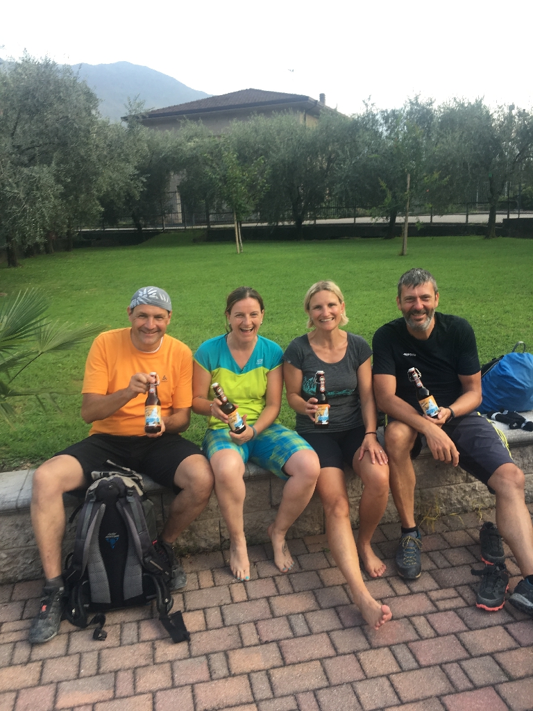 Kurz vor Schluss schwanken unsere Gefühle, zwischen Vorfreude aufs Ankommen, Duschen, frische Klamotten anziehen, Aperol Spritz schlürfen, Pizza essen und Bedauern, dass die Tour gleich vorbei sein wird. Gegen 18.30 Uhr kommen wir schließlich in unserer Unterkunft B&B Moleta (Tiziana) http://www.alamoleta.it/ an, super glücklich, geflasht und stolz! Der Gastwirt begrüßt uns mit Bier, dann gibt‘s als Überraschung für meine Mitstreiter noch original Kluftinger Bier (signiert) https://www.kluepfel-kobr.de/newsreader-k-k/klufti-bier.html.