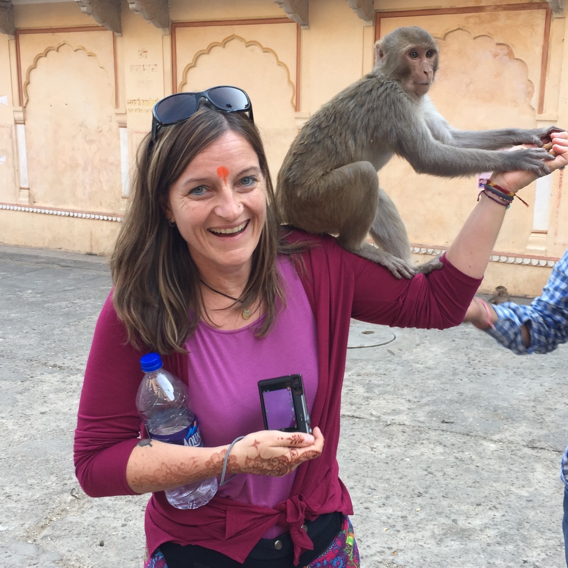 Während das Tattoo trocknet laufen wir zum Tempel oberhalb des Denkmals hoch; ganz schön anstrengend bei der Hitze und nicht gerade frischen Luft der Stadt… Trotzdem schön – man hat von dort oben einen super Blick über Jaipur. Und wir sehen einen kleinen, knallgelben Wellensittich, der sich wohl verflogen hat.