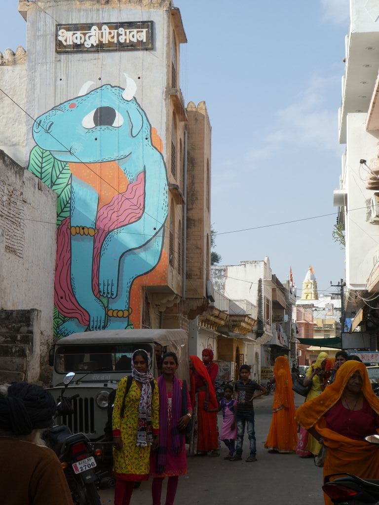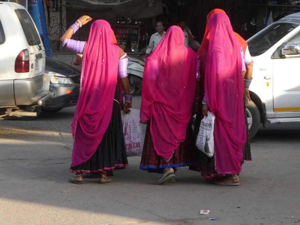 Nach dem Tempelbesuch fährt Taank uns noch in den Ort Sadri. Dort bummeln wir etwas herum. Wir sind als einzige Ausländer einmal mehr Blickfang und Gesprächsthema für die Einheimischen. Ich fotografiere dann noch ein paar rote Turban-Träger (einer davon ist gerade am Häkeln), nachdem ich höflich gefragt habe, außerdem bunt angemalte Kühe und Damen mit speziellem Oberarm-Schmuck, und dann neigt sich wieder ein schöner Tag zu Ende.