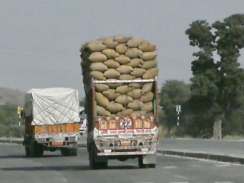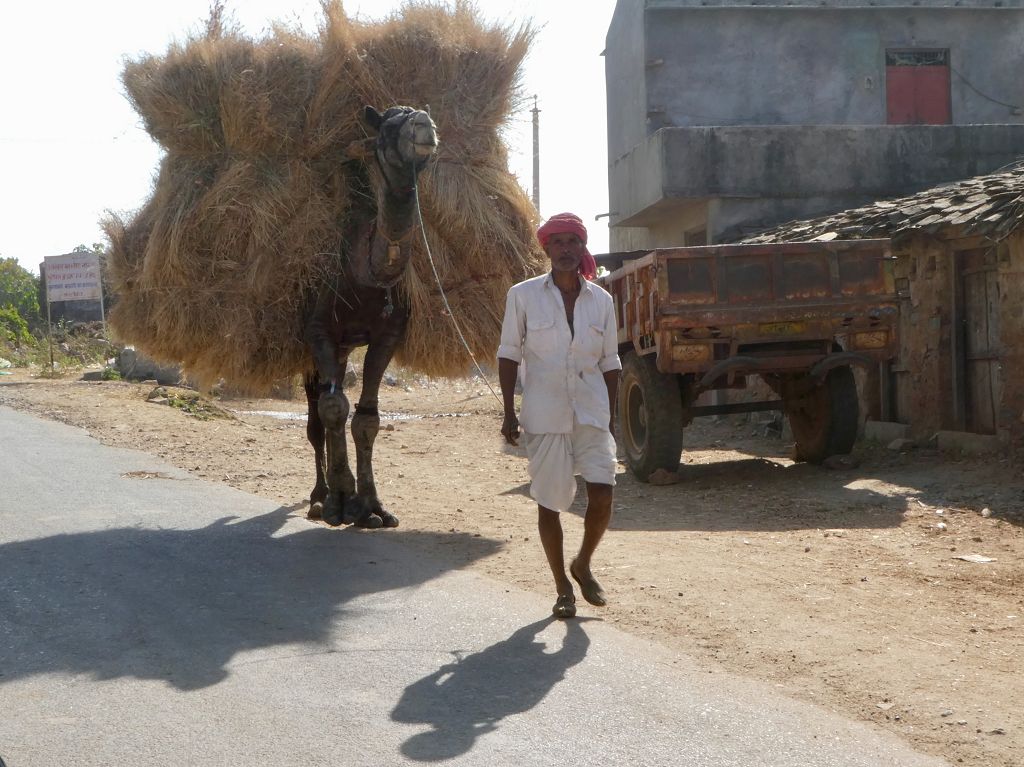 Ab und zu wird die Landschaft etwas hügelig und je mehr wir uns Rajasthan nähern, umso öfter sehen wir Kamele als Lasttiere.