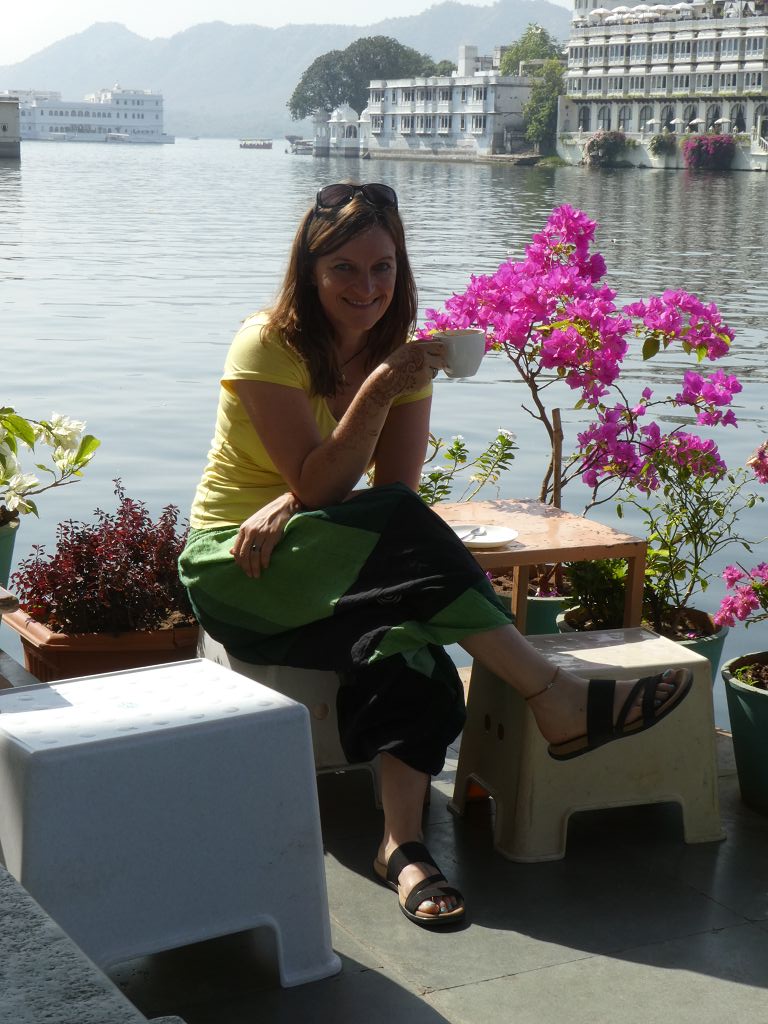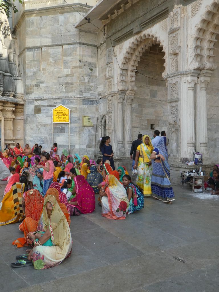 Wir spazieren erst über die kleine Brücke, dann Richtung City Palace. Davor haben wir in einem Café direkt am Pichola-See einen Cappuccino getrunken. Sehr schön!
