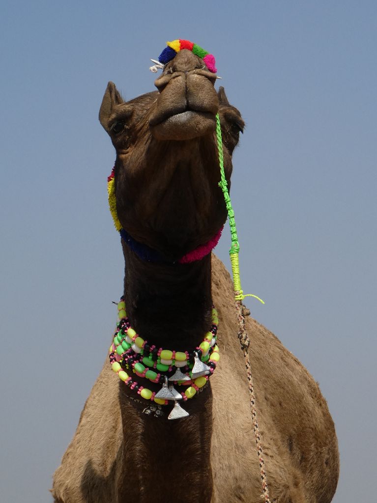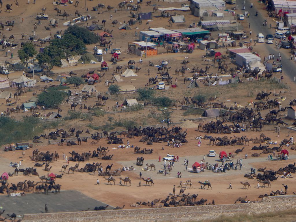 Nach dem Abstieg laufen wir zum Gelände des Kamelmarktes, der morgen offiziell losgehen soll, wo aber bereits heute viel geboten ist. Unzählige Kamelwagen mit Dach für Ausfahrten, ganze Kamelherden, viele Essenszelte, schöne gepflegte Pferde, Riesenräder etc. Sehr interessant.