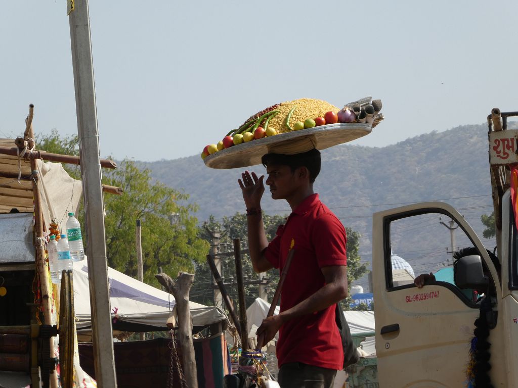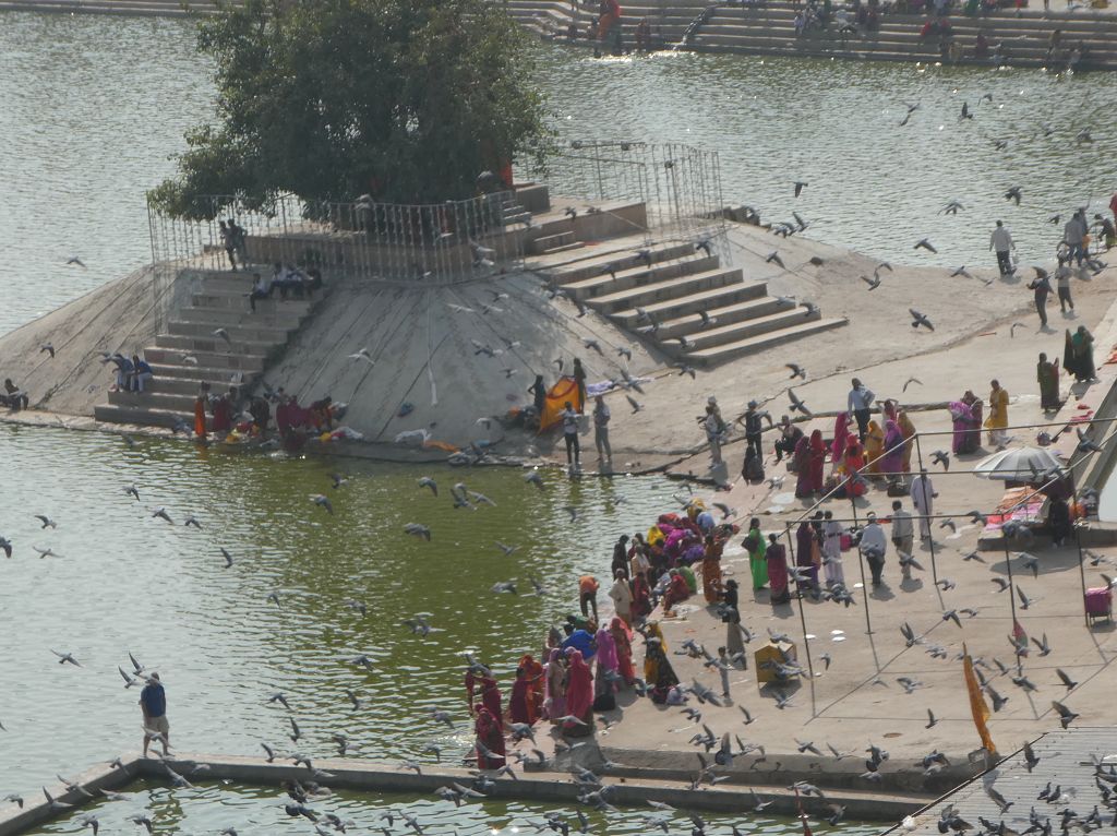 Den See mit den Pilgern umgehen wir weitläufig – muss ja nicht sein, dass wir die hinduistischen Rituale stören. Außerdem wollen wir ja auf den Berg zum Savutri Tempel und dann hauptsächlich die Kamele sehen. Wir laufen mit Abstecher über die Bazarmeile Richtung Berg.