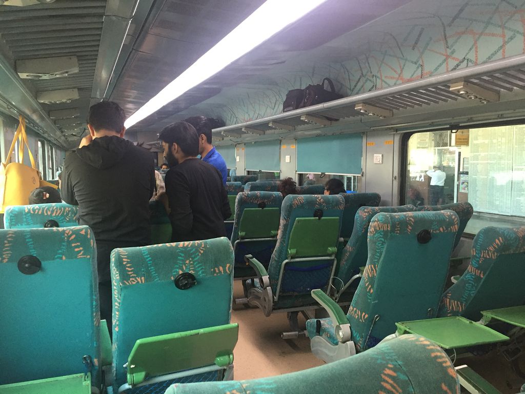 Die Fahrt (AC Chair Car – eine der etwa acht verschiedenen Zugklassen in Indien) ist sehr komfortabel – und wir werden in den 7 Stunden Fahrt (443 km) reichlich mit Essen und Trinken versorgt.