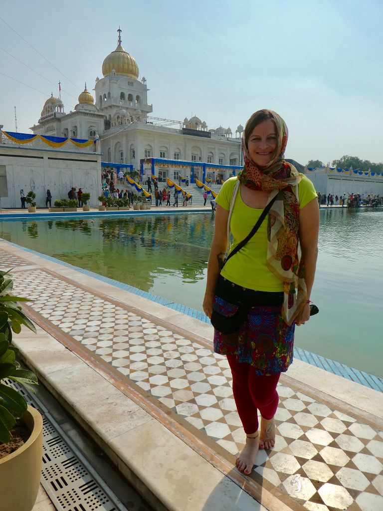 ‚Ein schöner großer Platz, der einlädt um ein bisschen zu verweilen und in Ruhe die Leute zu beobachten. Ich bekomme am Eingang einen lila Umhang, damit auch alles schön bedeckt ist. Mit Ruhe ist nach kurzer Zeit allerdings nix mehr, weil alle möglichen Inder ein Foto bzw. ‚Selfie‘ mit uns machen wollen. Junge Typen, aber auch Frauen und Väter, die ihre Kinder mit uns fotografieren möchten. Schon sehr lustig!