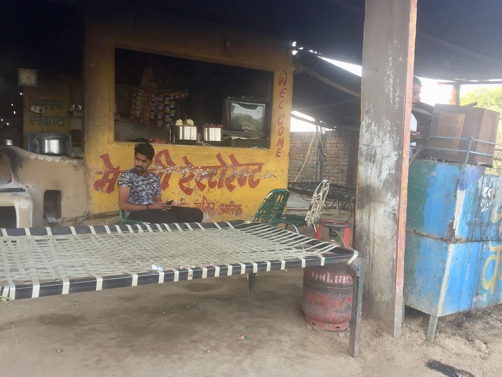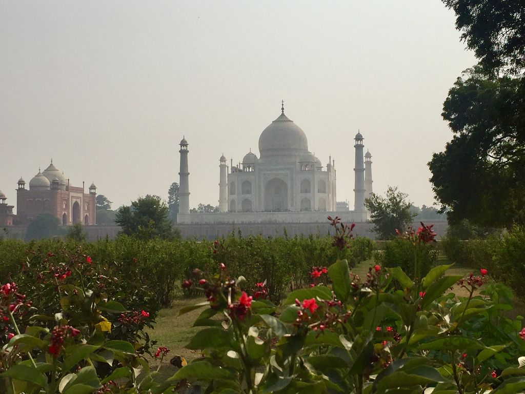 Allerheiligen in Deutschland – Highlight Nummer 1 der Reise für uns: Taj Mahal. Wir machen uns früh auf und verlassen die erwachende Hauptstadt in Richtung Agra. Je weiter wir von der Stadt wegkommen, umso weniger Smog liegt in der Luft. Um Delhi herum kann man kaum ein paar hundert Meter weit sehen. Nach und nach wird es grüner, mit vielen Ackerflächen, die bei der langanhaltenden Trockenheit (ca. 8 Monate im Jahr Hitze und kaum Regen) mühsam bewässert werden müssen. Mit durchschnittlich 80 km/h rollen wir gemächlich auf der breiten und wenig befahrenen Straße dahin. Zur Frühstückspause halten wir an einer schönen Raststätte. Mittags kommen wir in Agra an.