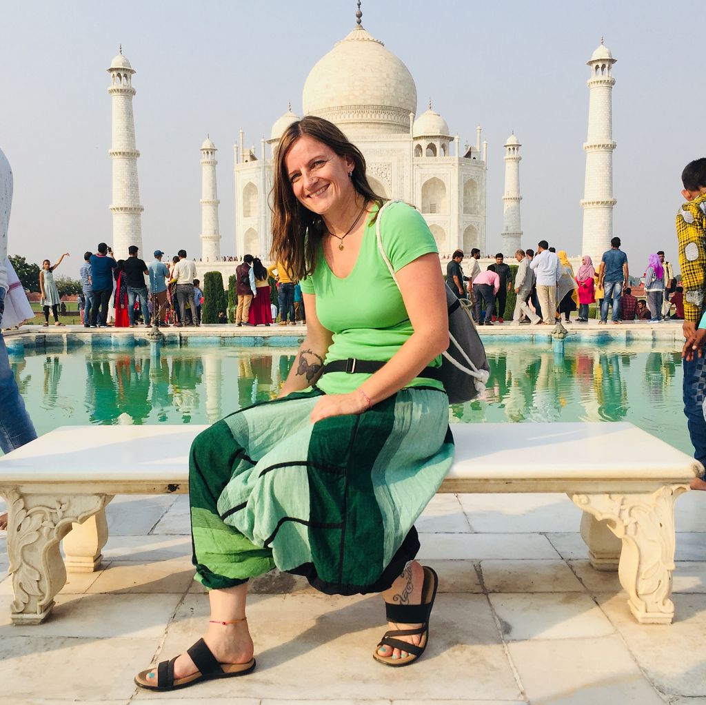 Beim Rundgang durch die Anlage haben wir einen Sikh als Führer, der uns die unglaubliche Geschichte des Monuments erklärt, das zwischen 1632 und 1653 von 20.000 Arbeitern zu Ehren der Lieblingsfrau des Shahs erbaut wurde, die nach der Geburt ihres 14. Kindes gestorben war.