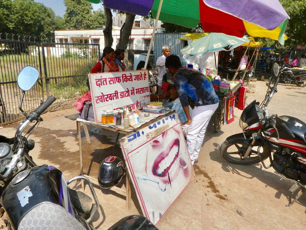Mittags besuchen wir ein Women Handicraft Projekt und spazieren über den örtlichen Markt, der alles bietet. Neben Straßenbarbier auch mobilen Zahnarzt, der gerade einem Patienten mit einer Schere (!) im Mund rumfummelt :-O.