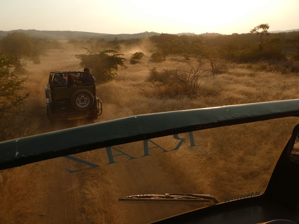 2. Highlight der Reise, die Tigersafari. Morgens um 6.30 Uhr werden wir abgeholt und fahren mit einem sogenannten „Canter“-Wagen, einem einfachen, aber sehr stabilen Gefährt, auf das 20 Personen passen, in den Ranthambhore Nationalpark. Anfangs ist es noch recht kühl – gut, dass im Reiseführer stand, dass man sich erstmal was Warmes anziehen soll.