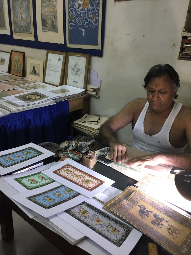 Nach einer Teepause am Nachmittag besuchen wir noch das Atelier eines Künstlers, der Miniaturzeichnungen macht und dafür schon im Marco Polo Reiseführer erwähnt wurde, Raju Swami.