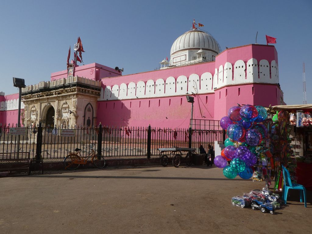 Wir fahren heute zunächst zu einer der „kuriosesten Sehenswürdigkeiten Indiens“, wie es der Reiseführer treffend beschreibt. Zum Rattentempel von Deshnok, ca. 30 km südlich von Bikaner. In dem außen rosafarbenen Tempel tummeln sich Tausende von Ratten, die als heilig, da unsterblich gelten.