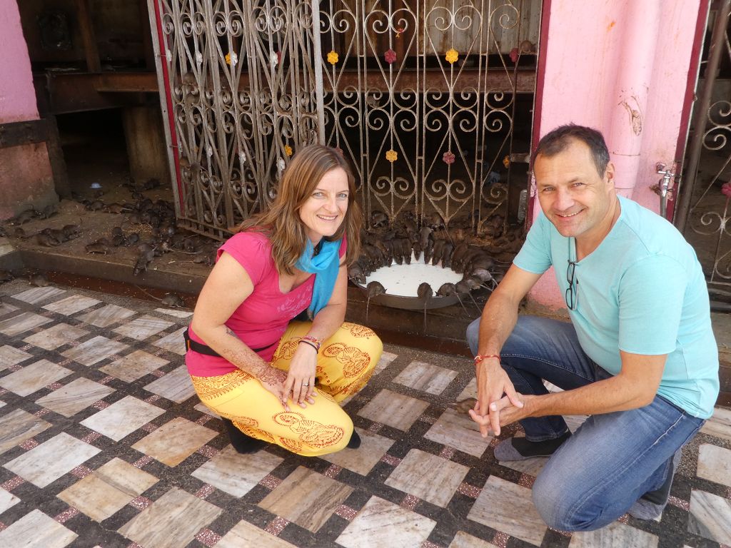 Wenn einem eine Ratte über den Fuß läuft, bringt das Glück. Wenn man dagegen versehentlich auf eins der Tierchen tritt, ist das ganz ungünstig für’s Karma. Ich glaub, mir ist nur mal eine über die Zehen gehuscht. Also alles im grünen Bereich. Drinnen legen sich die Hinduisten zum Teil sogar auf den Boden des Tempels und küssen denselben, um ihre Verehrung zu zeigen. Alles ziemlich schräg.