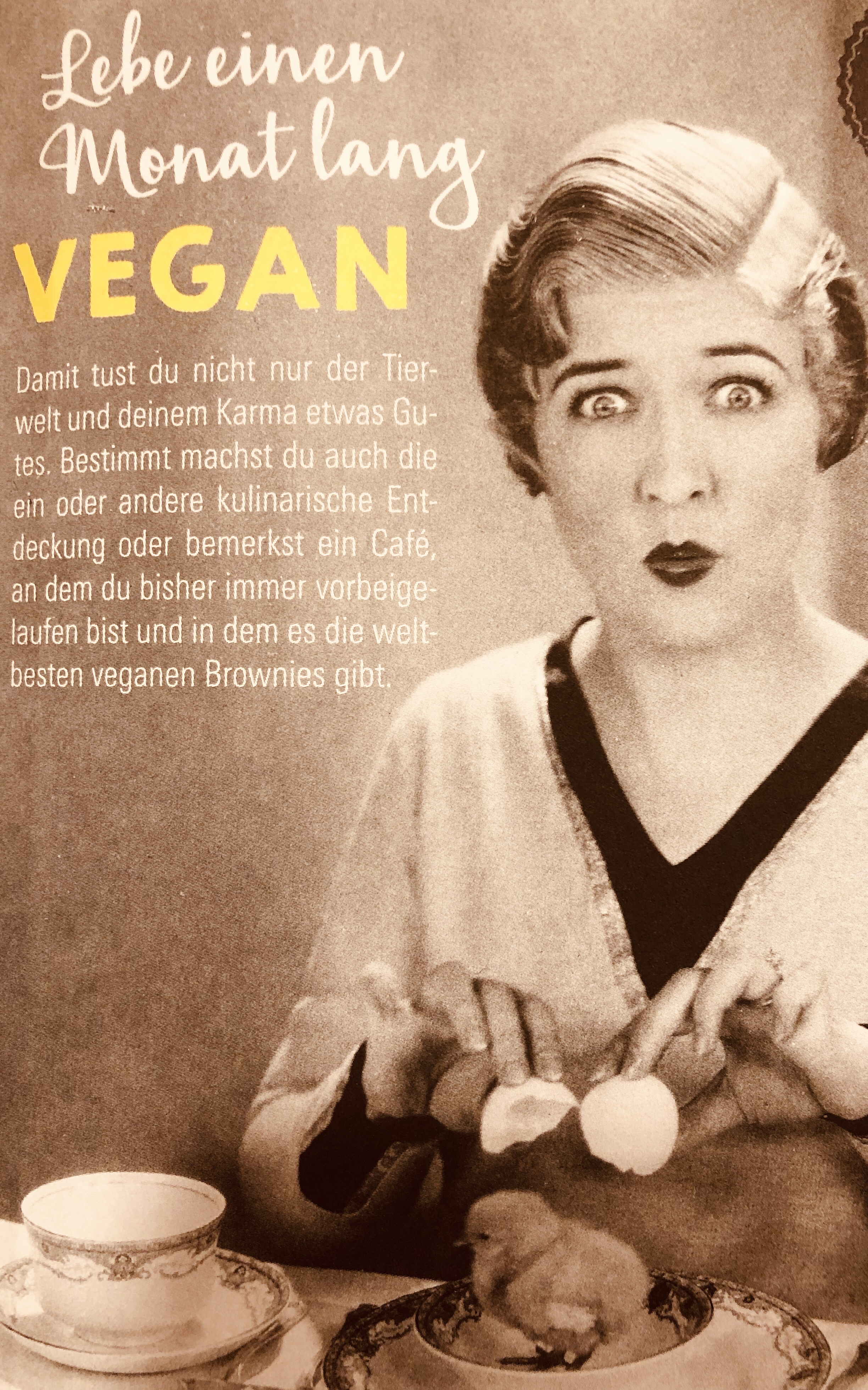 Ich möchte vorausschicken, dass ich dieses Experiment nicht mit übertriebenem Ernst angehen werde, und daher beschränke ich mich auf’s Essen (das wird sicher schwierig genug, zumal ich meine Mittagspause üblicherweise mit anderen Fleischessern in Restaurants mit nicht gerade üppiger Auswahl an vegetarischen geschweige denn veganen Speisen verbringe!).