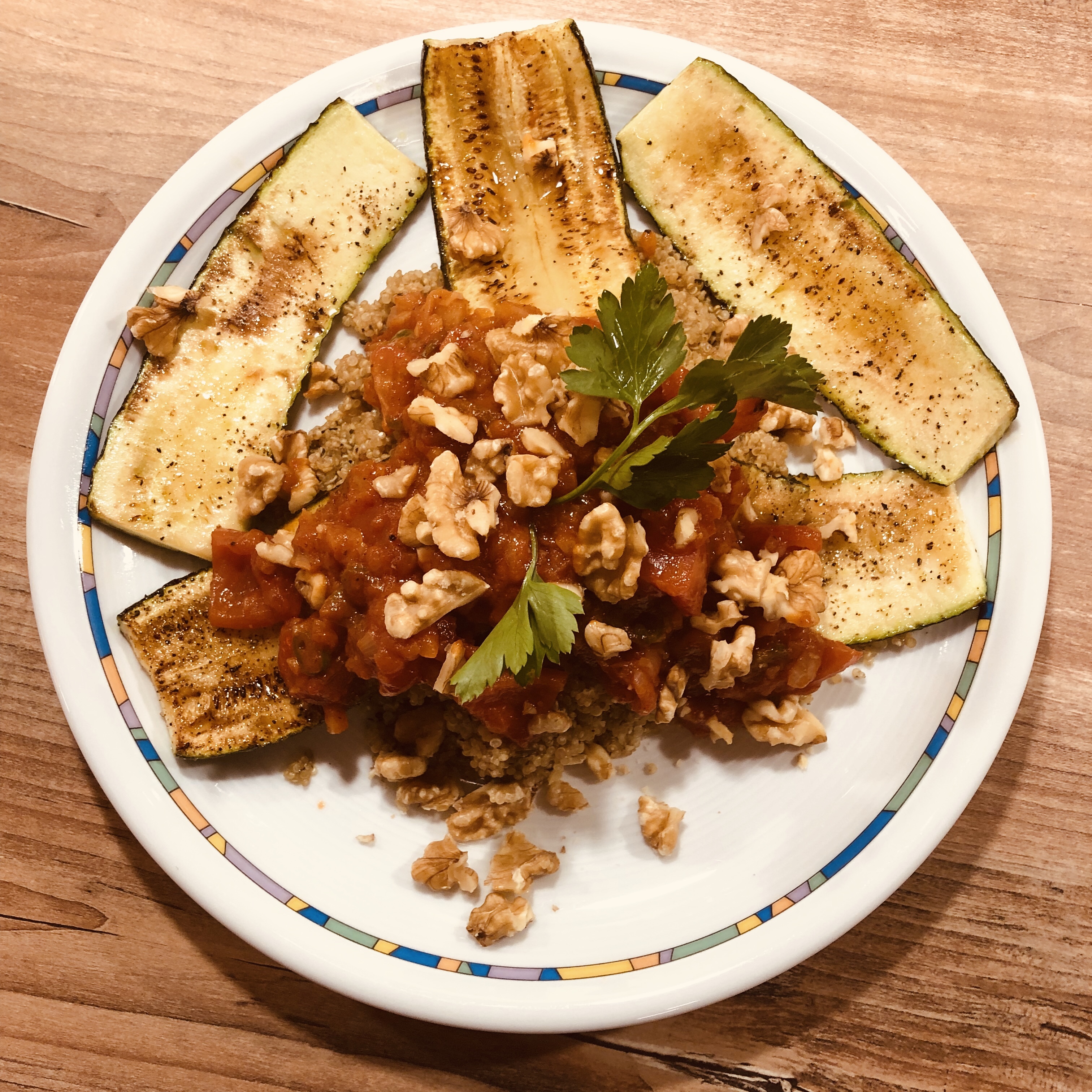 Abends hab ich Zucchinischeiben gegrillt, diese auf gekochtem Quinoa und gedünsteten Tomaten zubereitet und mit zerstoßenen Walnusskernen garniert – war richtig lecker!