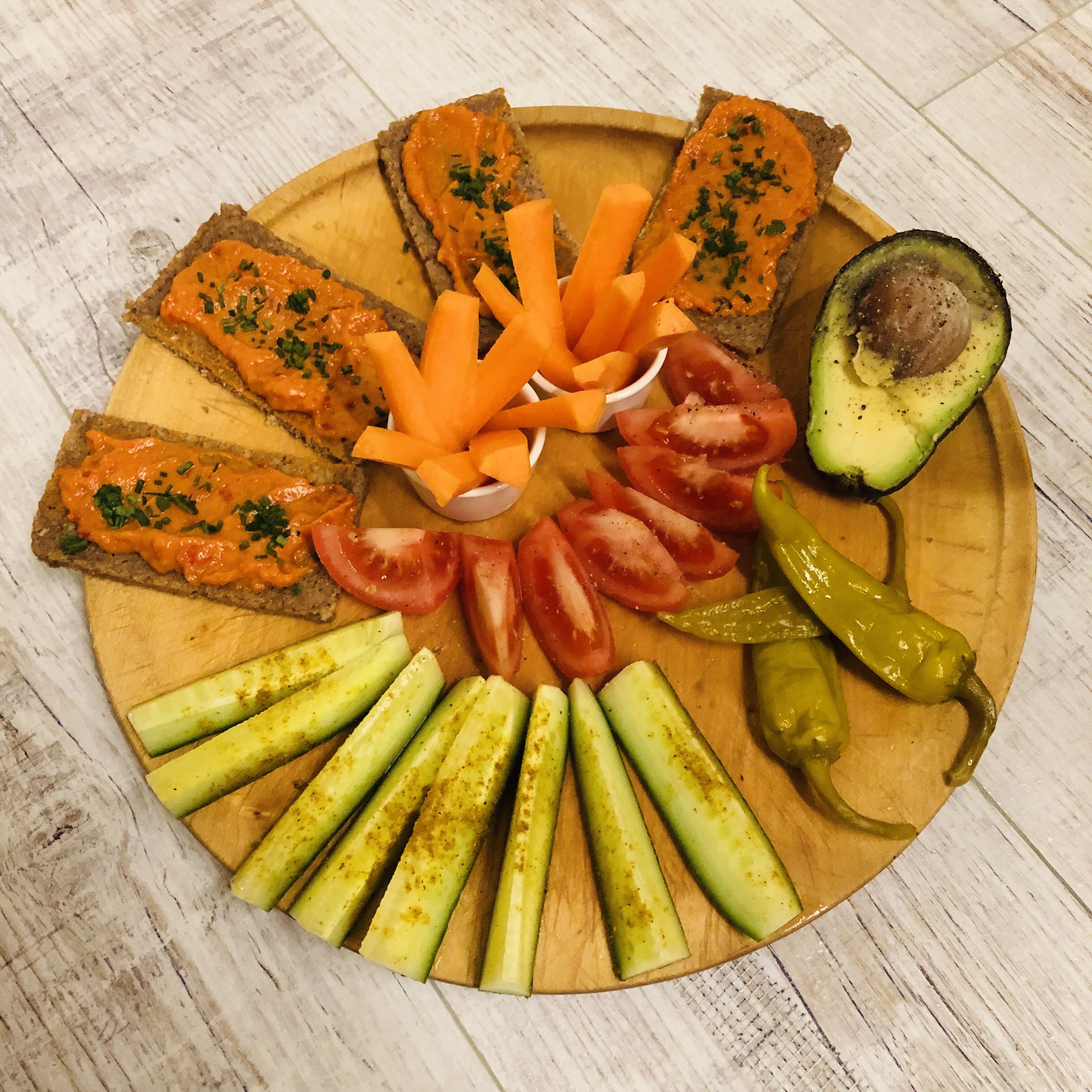 Abends gab’s noch Brotzeit mit dem restlichen Paprikaaufstrich und selbstgemachter Guacamole (blöderweise die dritte Avocado in einer Woche, die innen braun war – man konnte sie aber trotzdem noch essen!). Dazu buntes Gemüse.