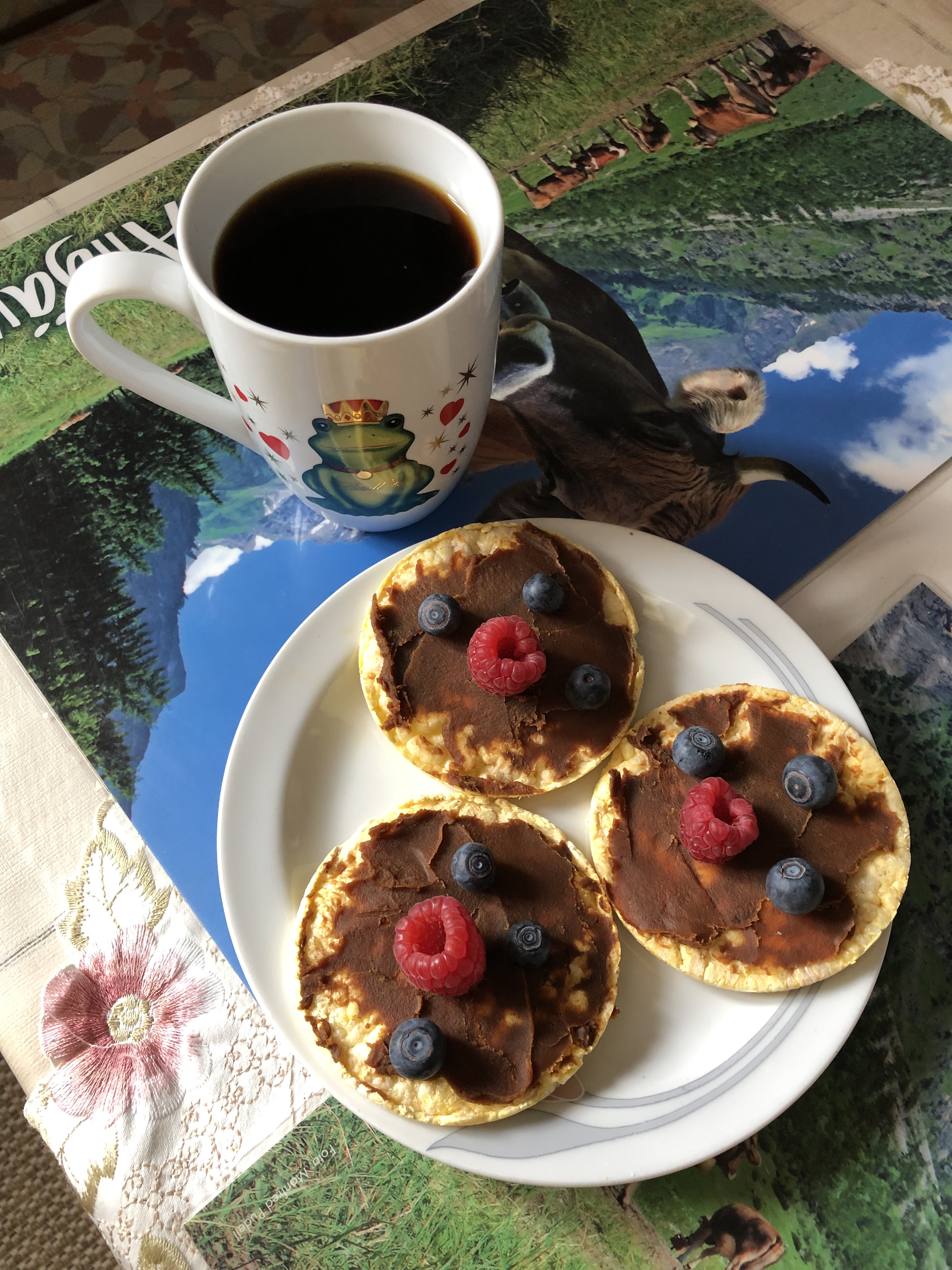 Statt Kuchen hab ich mir Maiswaffeln mit Kokosmilchcreme (aus Milch von Kokosnüssen und Kokosblütensirup) bestrichen und mit frischen Früchtchen garniert.