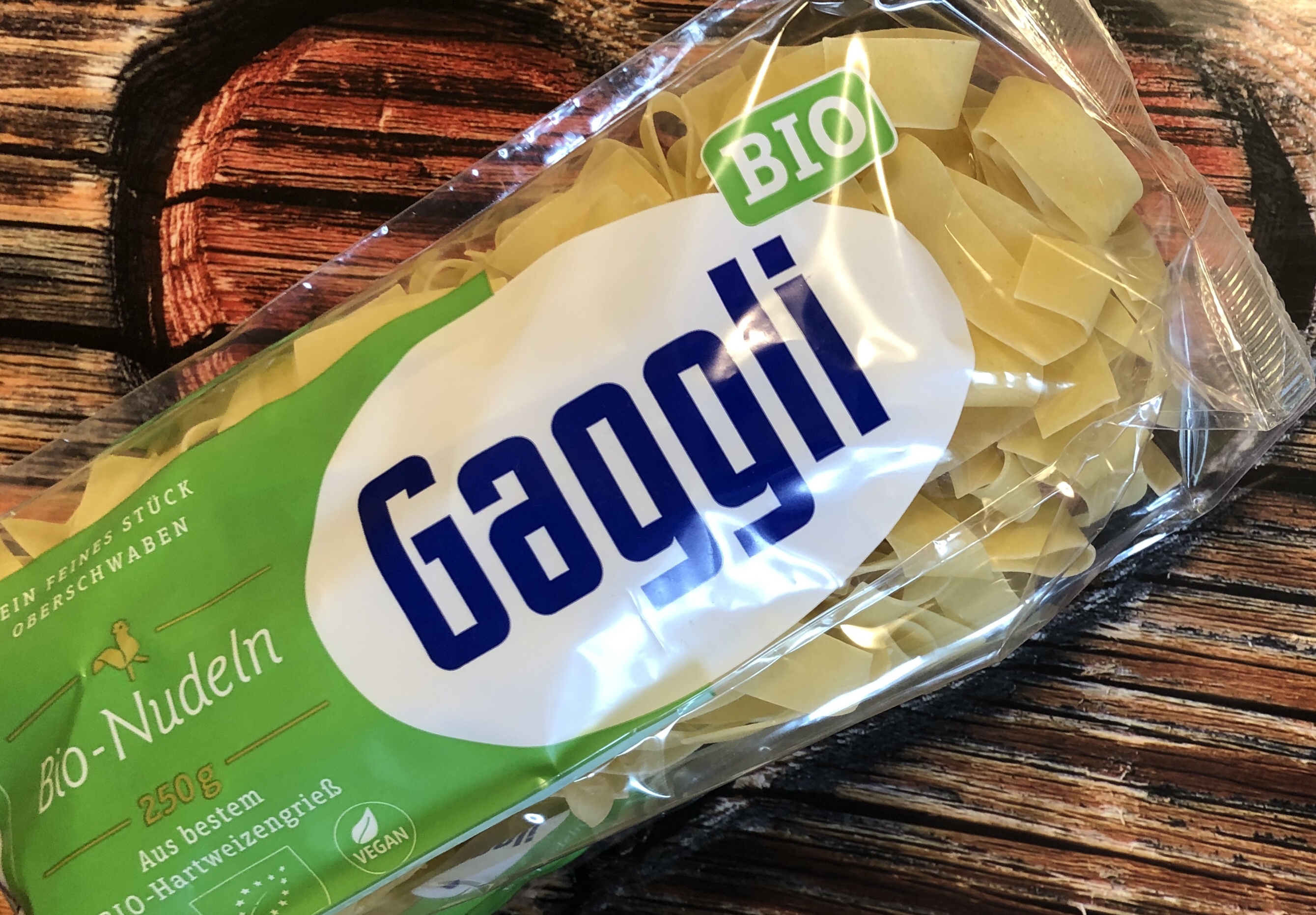 Mittags gibts schnelle Küche. Glücklicherweise hat meine Lieblingsnudelfirma (bei der zufällig mein Bruder arbeitet) auch vegane Bio- Bandnudeln im Sortiment.