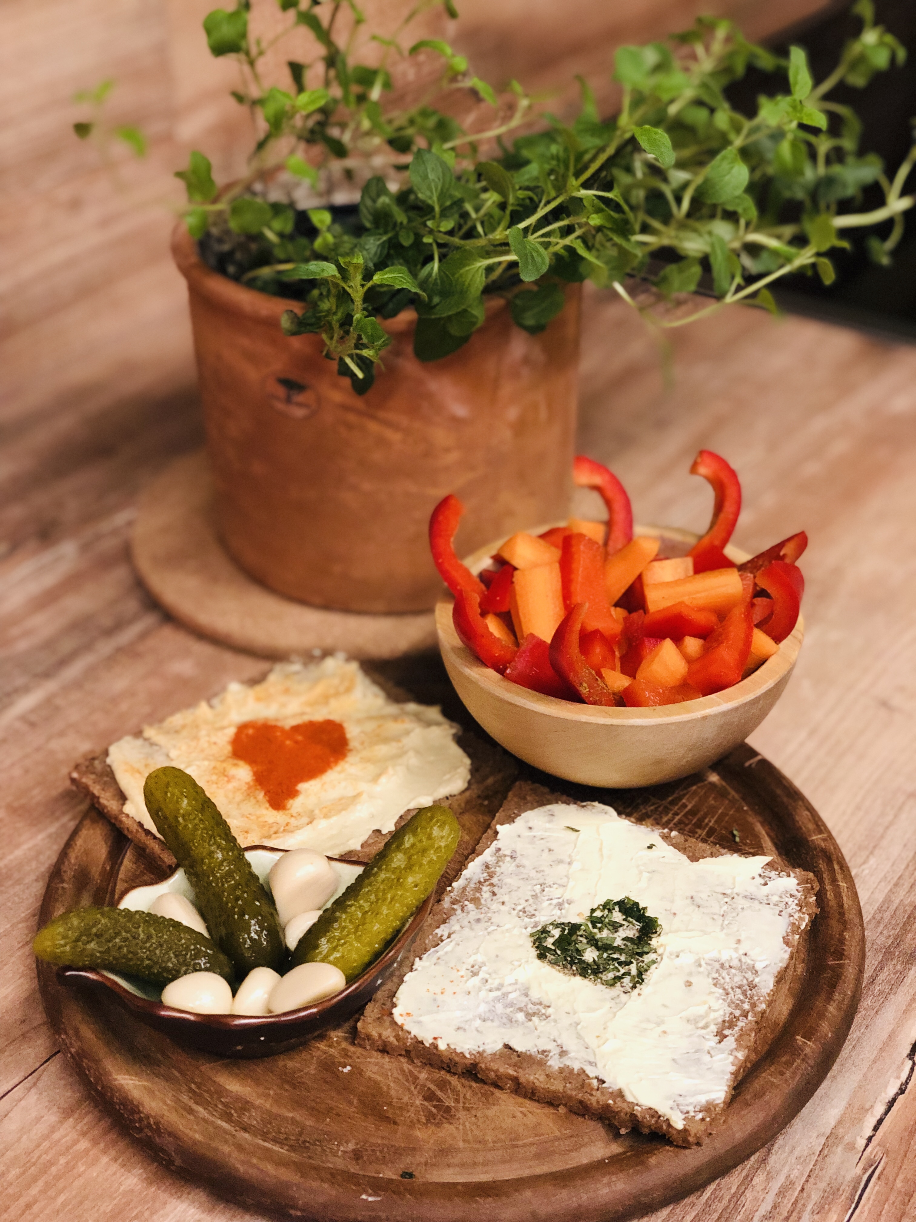 Am Abend hab ich mir wieder Brot mit Hummus und Paprika-Tomate Aufstrich gemacht – dazu Gurken, eingelegten Knoblauch und Paprikaschote. Einfach, und lecker.