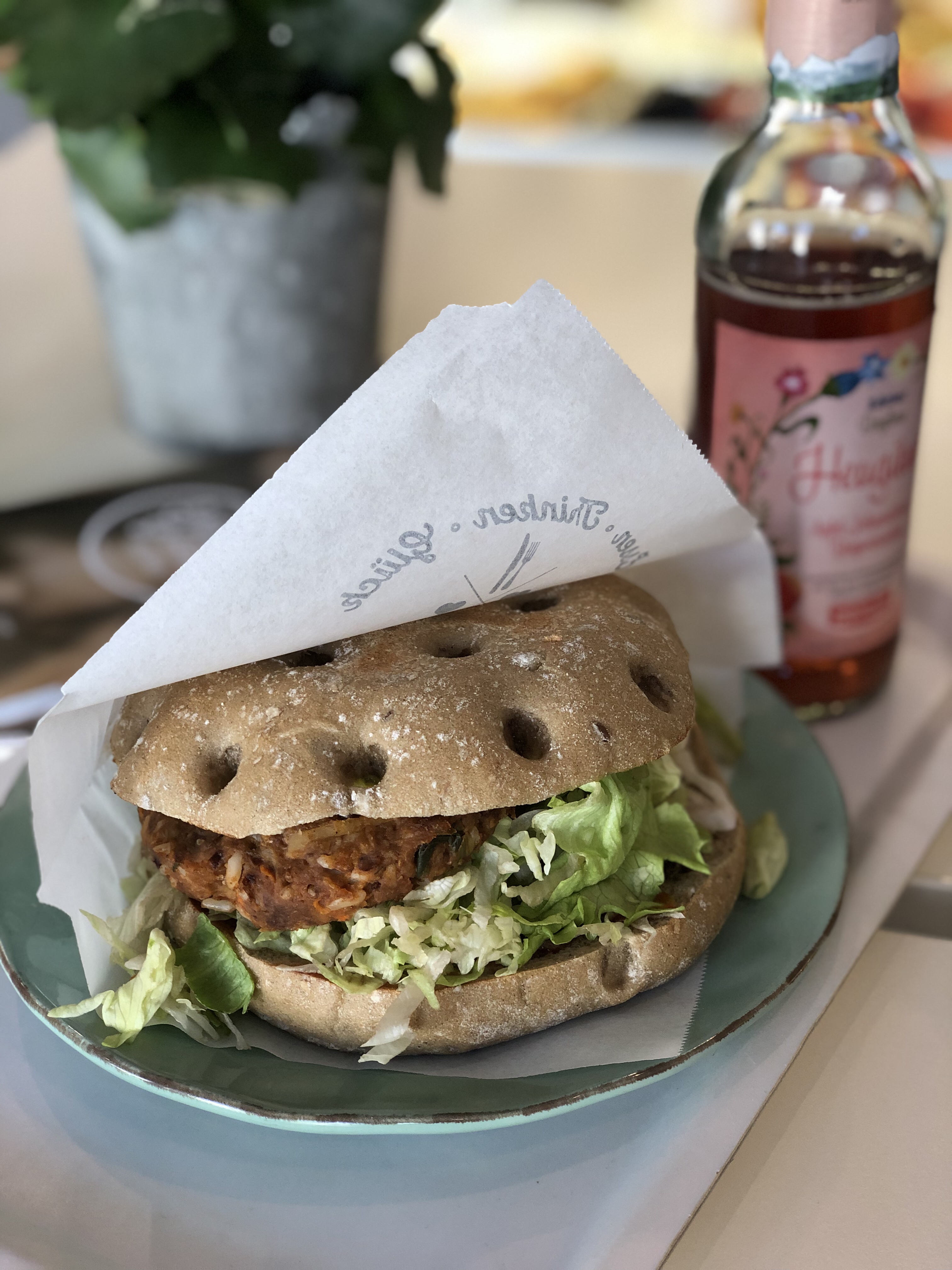 Mittags haben wir ein kleines Burger-Restaurant in der Stadt ausprobiert, das auch vegetarische und vegane Burger anbietet. Ich hab mir einen „Freigeist-Burger“ mit Schwarzbohne-Reis-Patty, Salat, Gurke, Zwiebeln und Guacamole gegönnt, dazu Berglimo – hat wunderbar geschmeckt.