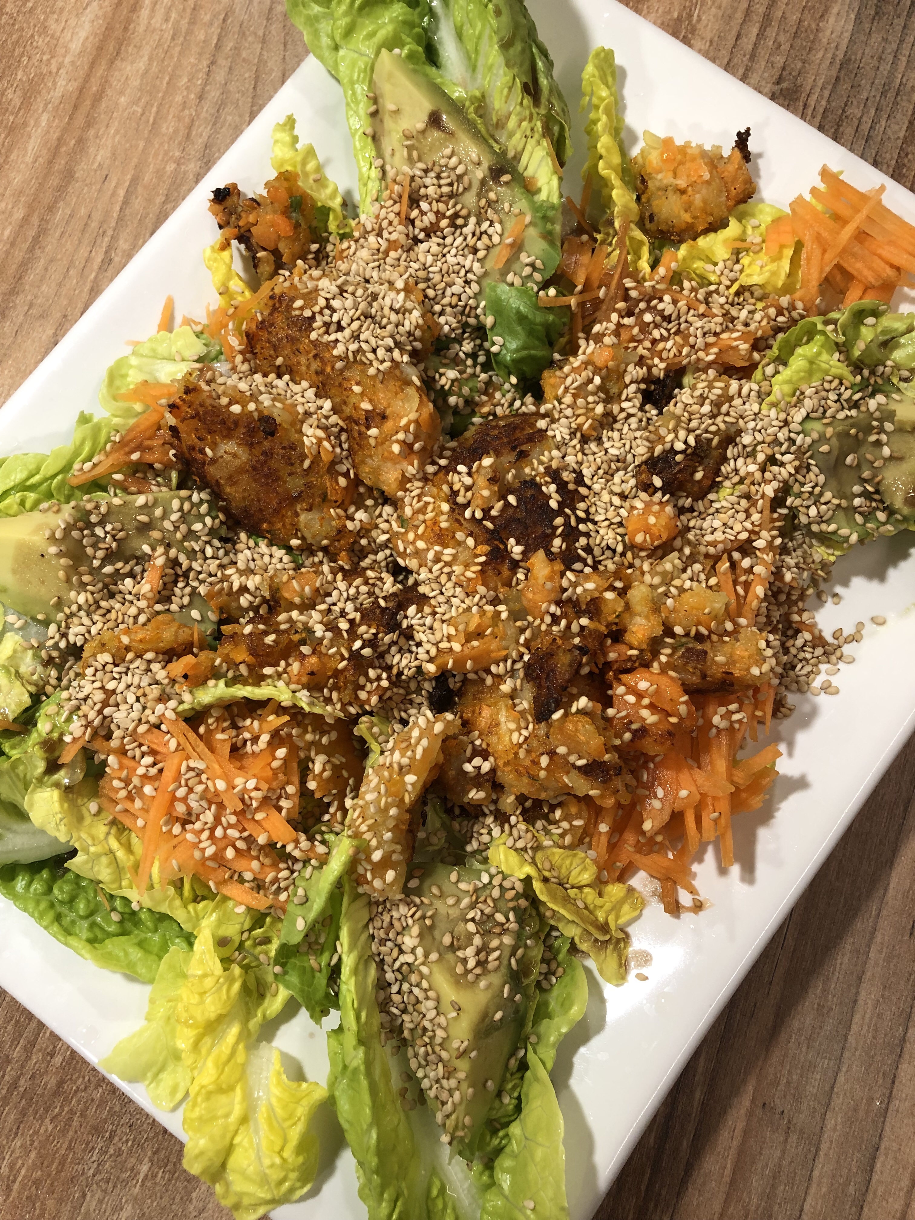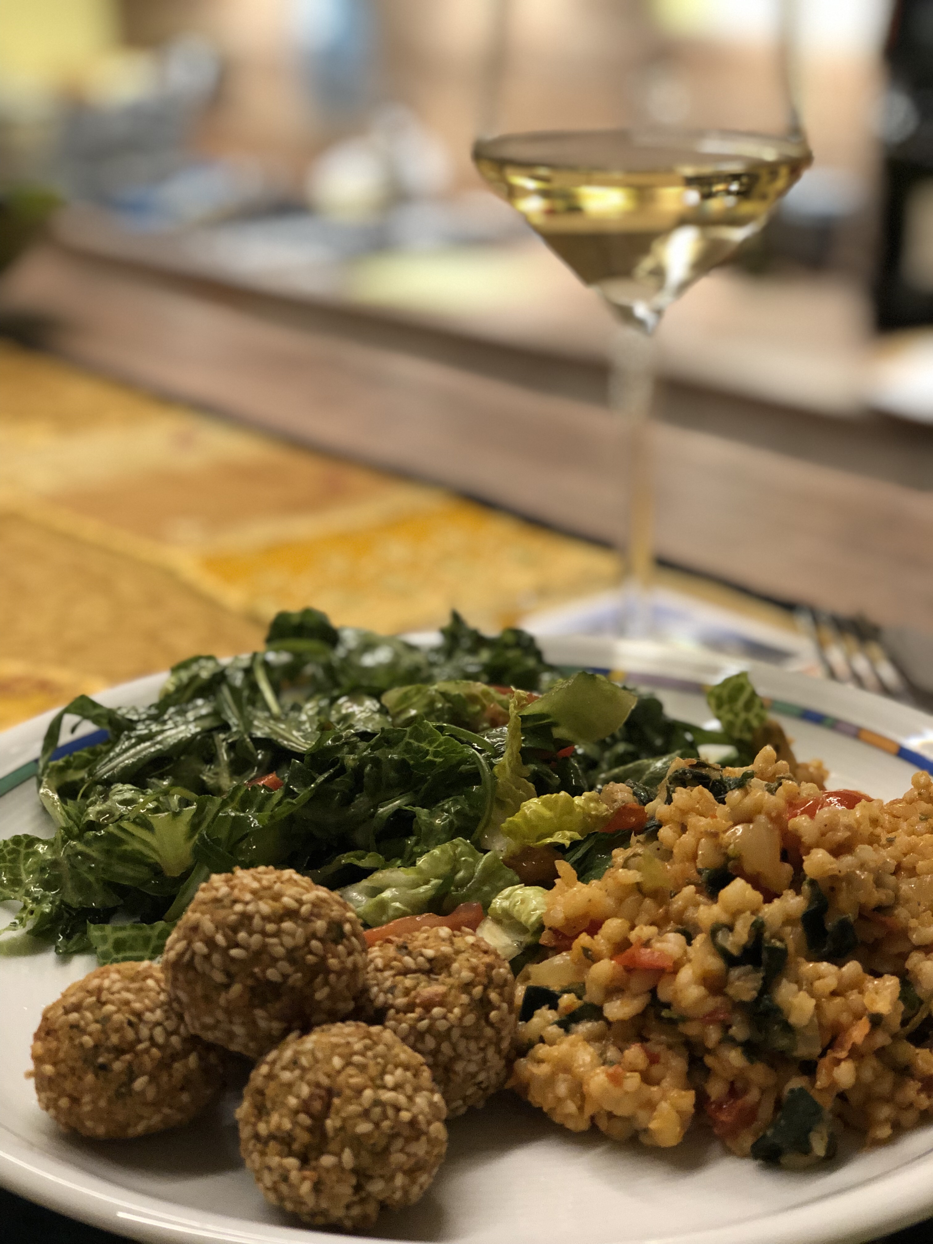 Abends wurde es noch leckerer. Mit Sesam ummantelte Falafeln auf Romana-Rucola-Tomaten Salat und als extra Kick Bulgursalat mit Sambal Olek, frischer Minze und Mangold. Zum Reinlegen!