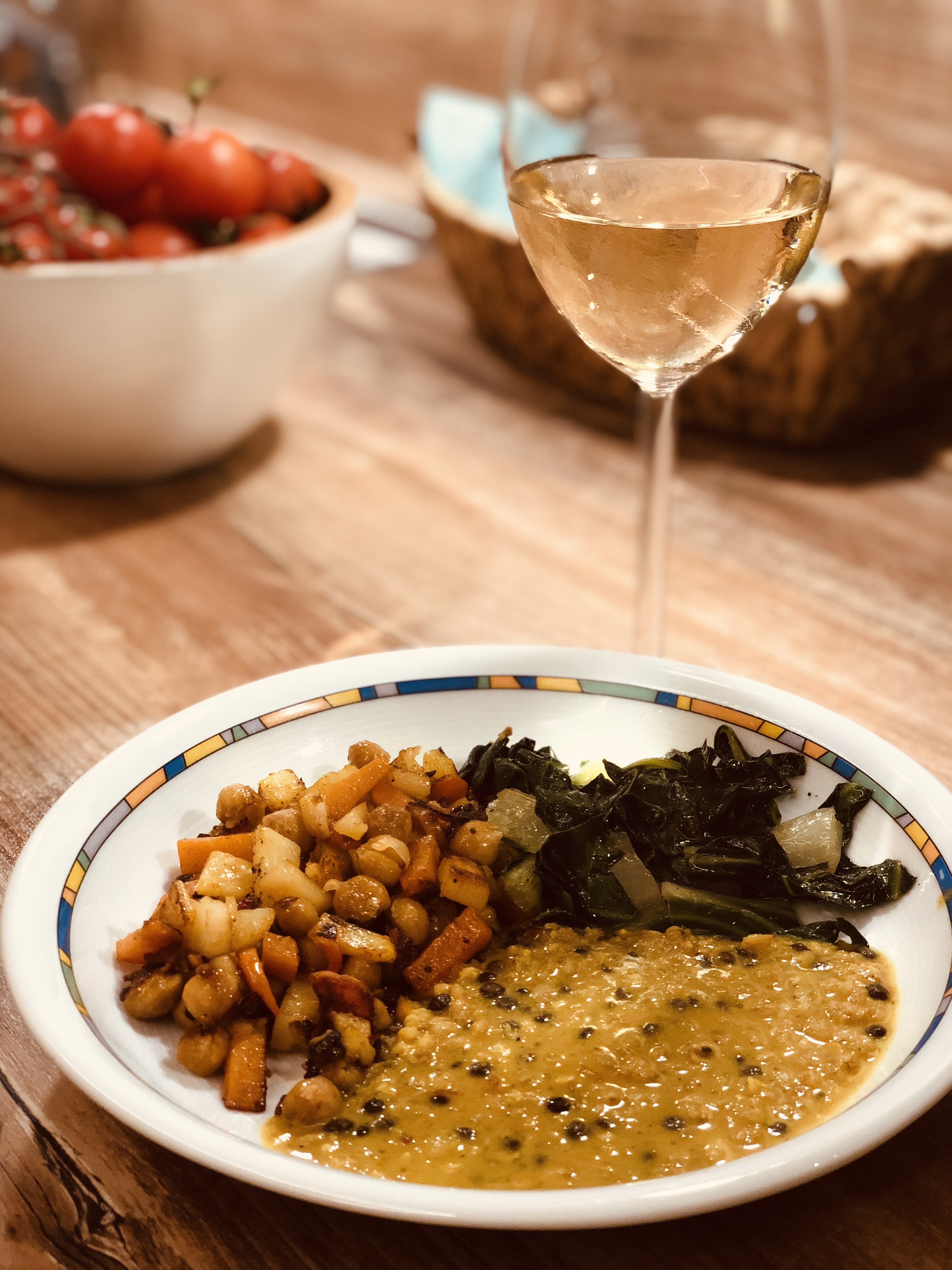 Zum Abendessen haben wir ein „Bayerisches Curry“ gekocht, eine Fertigmischung aus dem Bioladen mit allerlei gesunden und natürlichen Zutaten wie Urkorn, Belugalinsen. Buchweizen, Emmer, Liebstöckel und vielem mehr. Das alles mit Kokosmilch gekocht schmeckt richtig lecker. Dazu frisch gebratenes Gemüse (Kartoffel, Karotte, Kichererbsen, Süßkartoffel, Zwiebel) und Mangold. Wieder ein neues Geschmackserlebnis.