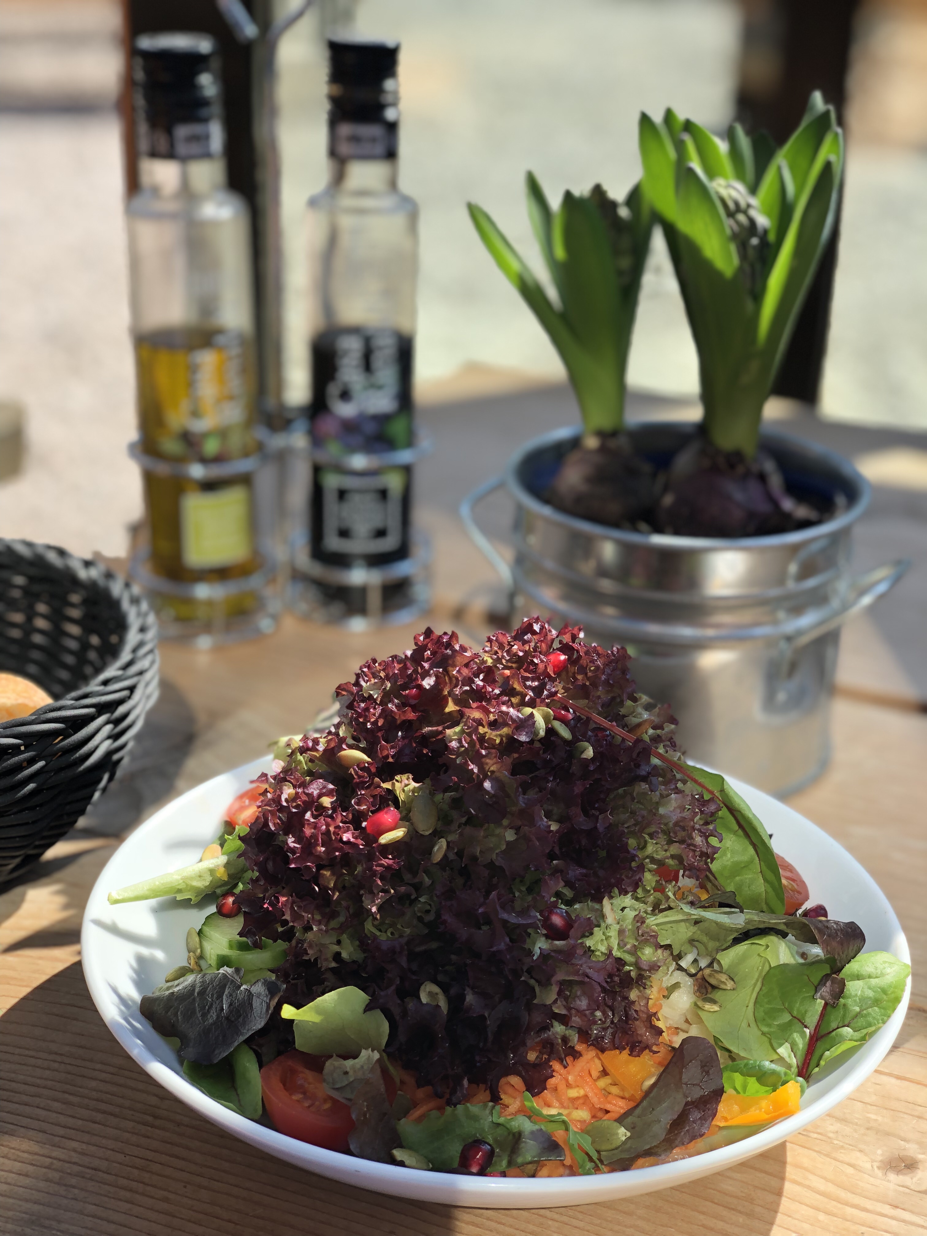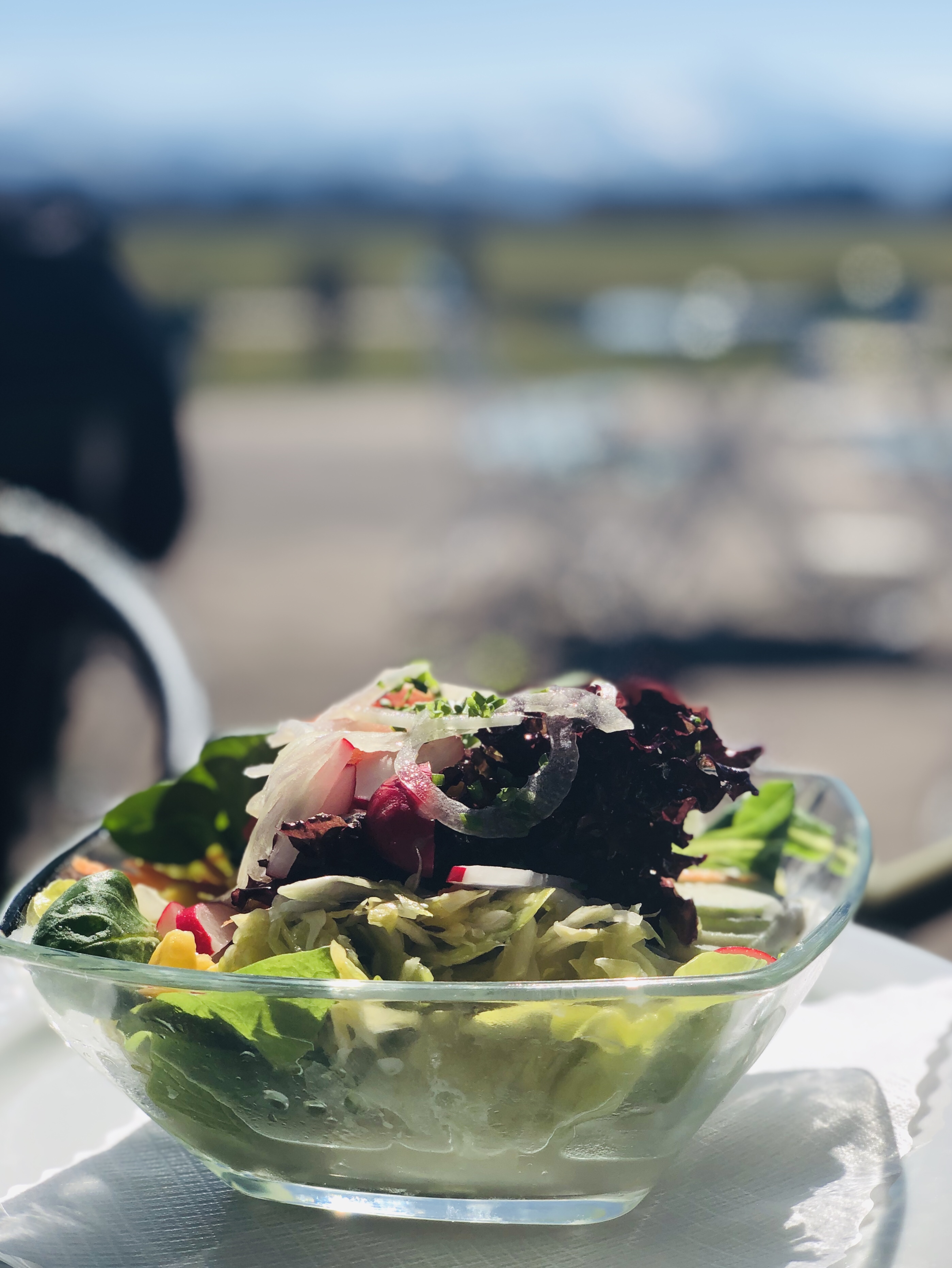 Langsam wird es frühlingshaft – mittags genossen wir die Aussicht auf die noch weißen Berge von der schönen Sonnenterrasse des nahegelegenen Flugplatzes aus. Das Essen dort ist immer sehr lecker, aber die Auswahl an vegetarischen und erst recht veganen Speisen ist ziemlich eingeschränkt. Also fiel meine Entscheidung spontan (mal wieder) auf einen gemischten Salat 😉.