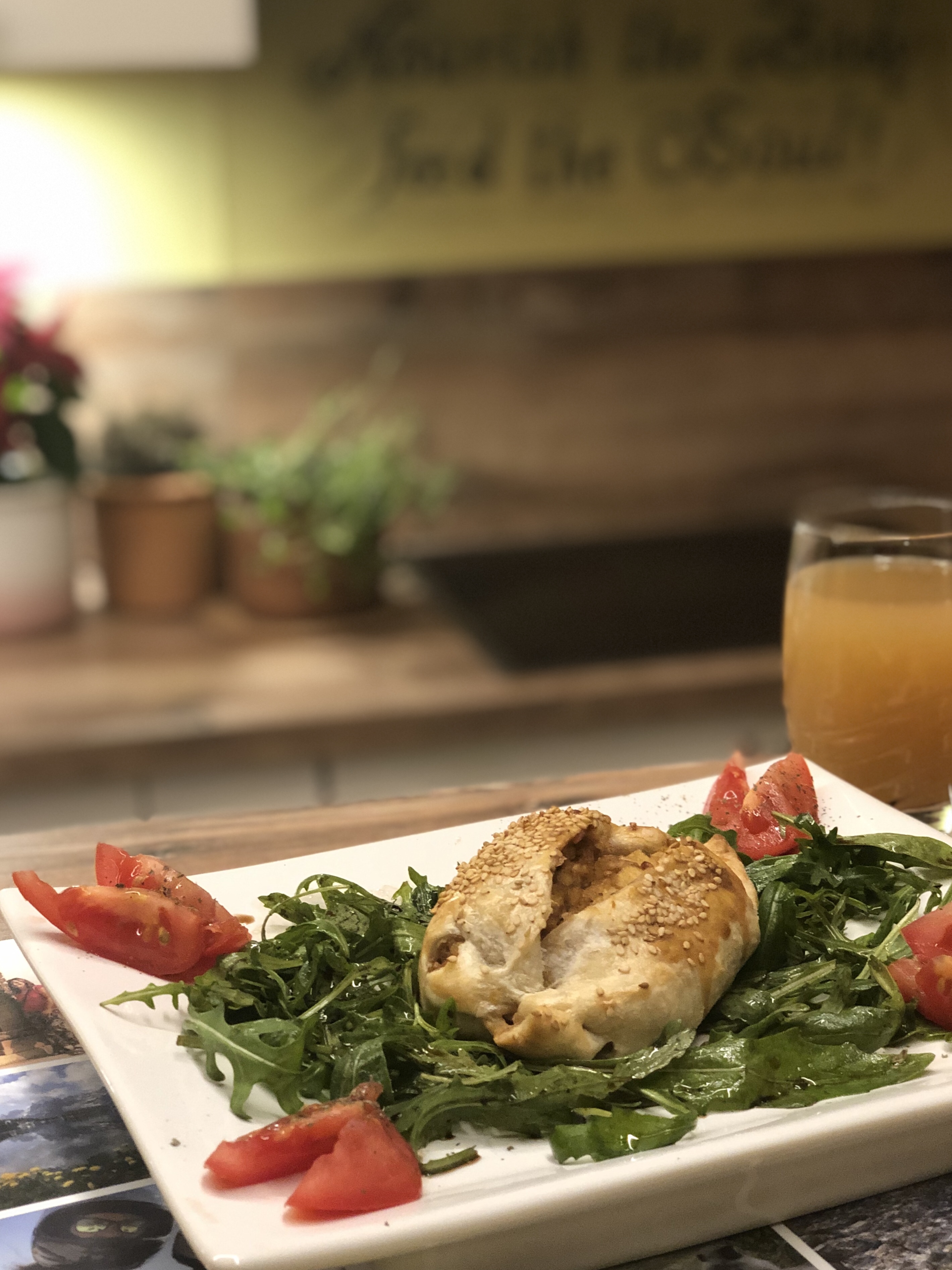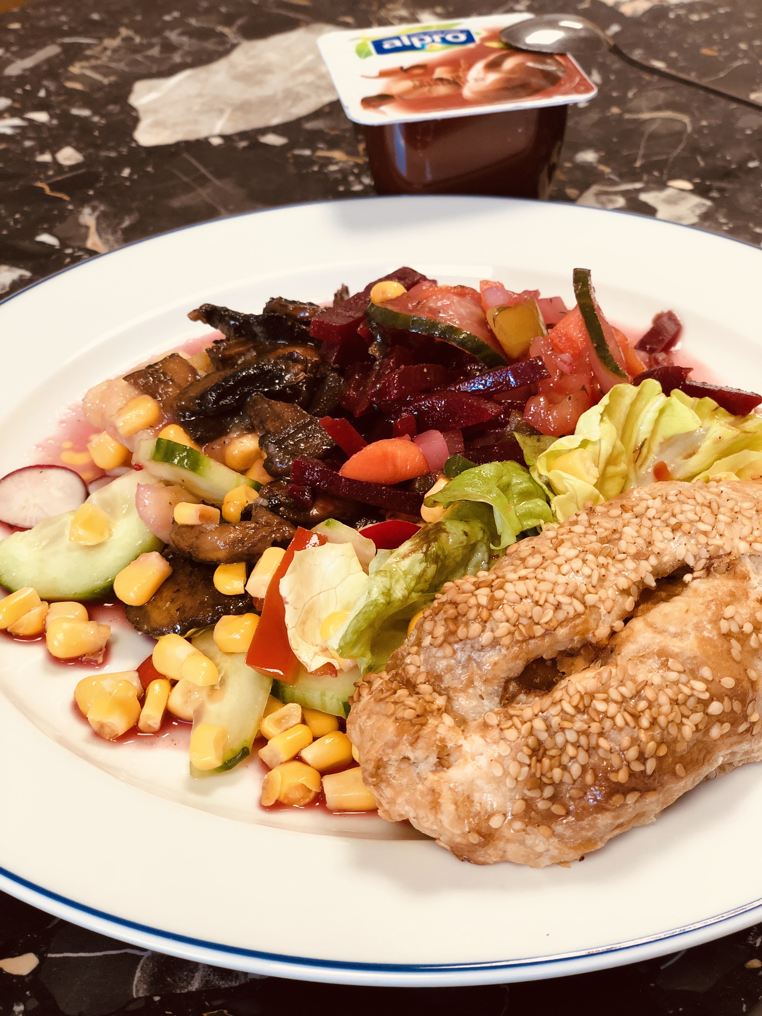 Heute Mittag musste ich kurz in die Stadt, hab mir was von der Salatbar im Supermarkt geholt und dann zusammen mit meiner letzten Blätterteig-Tofu-Linsentasche im Büro gegessen. Zum Nachtisch hab ich einen veganen Schokopudding „gefunden“, der richtig lecker geschmeckt hat. Gut, dass ich gleich eine Viererpackung gekauft habe 😊.
