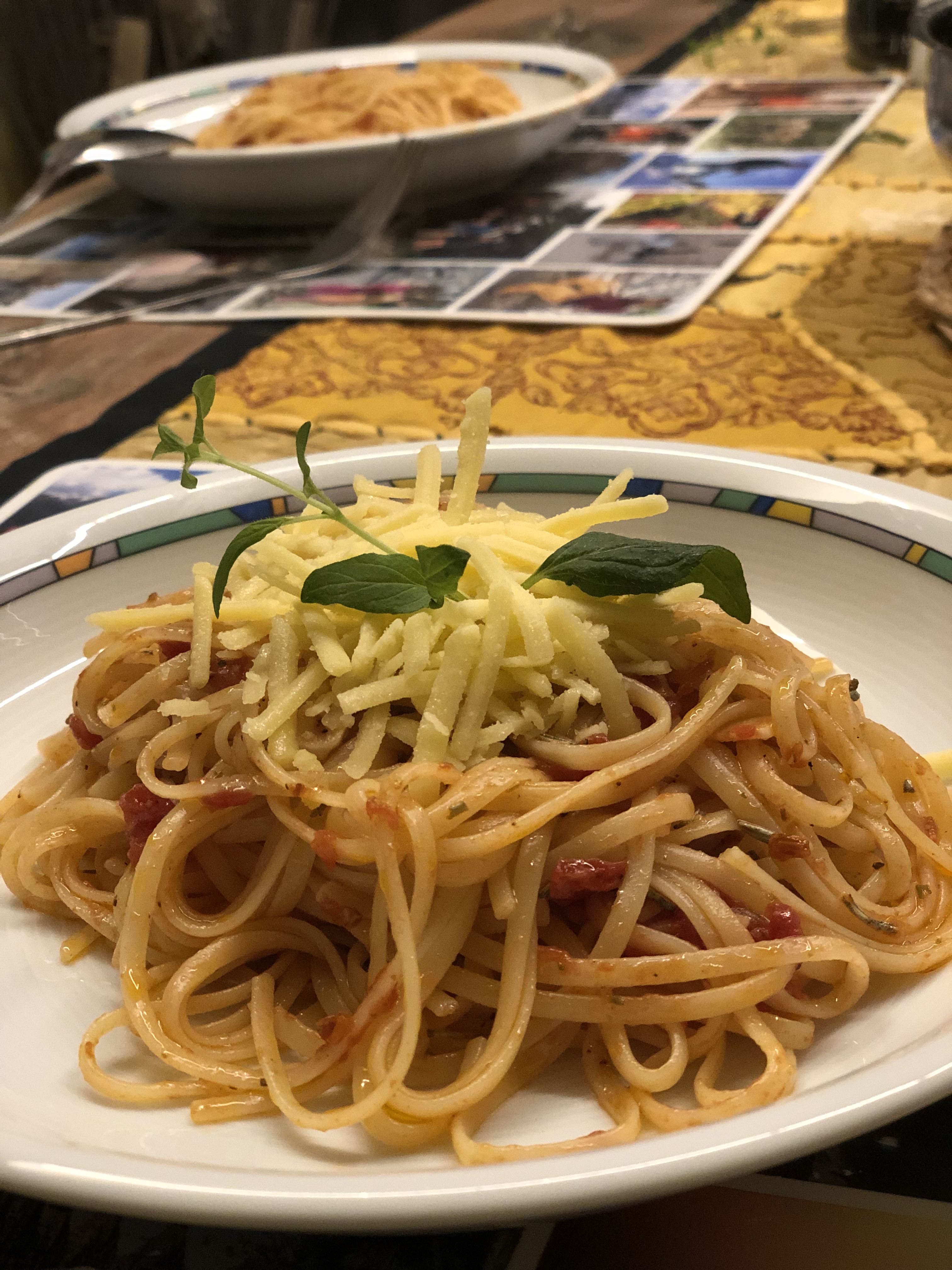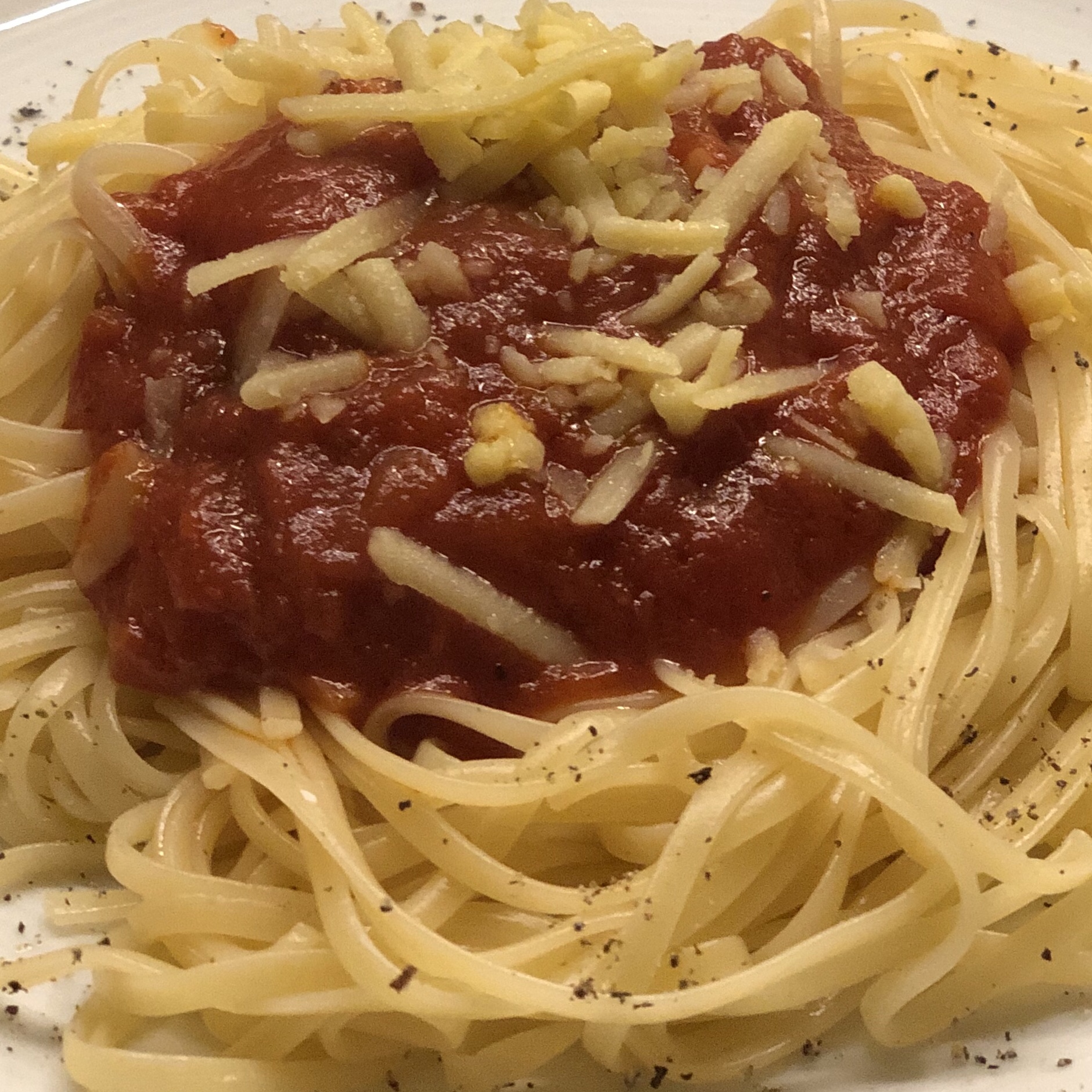 Das Abendessen war dafür nochmal richtig vegan – Hartweizenlinguine mit Tomatensoße (mit Knoblauch und Rosmarin verfeinert) und darüber den restlichen veganen Reibekäse gestreut.
