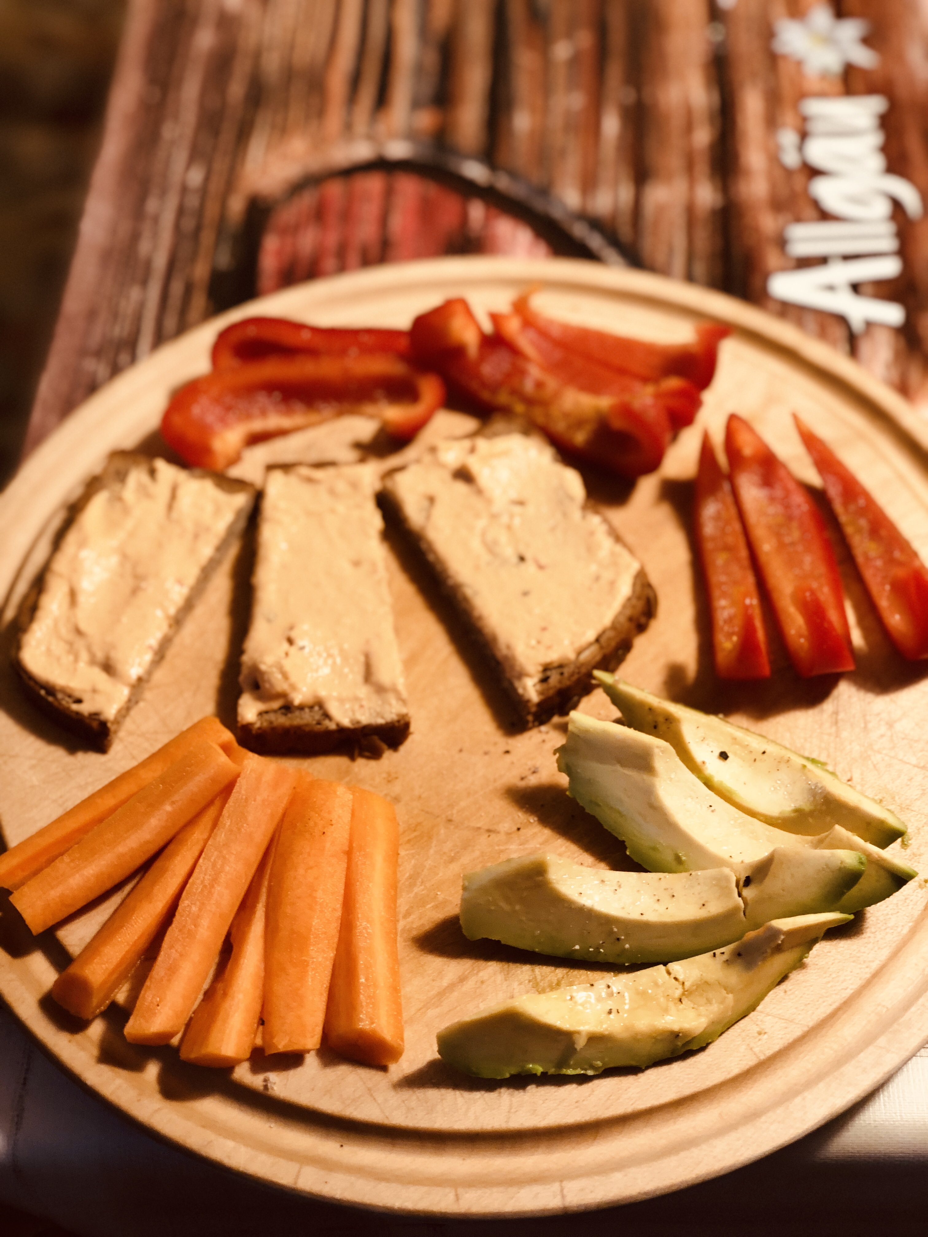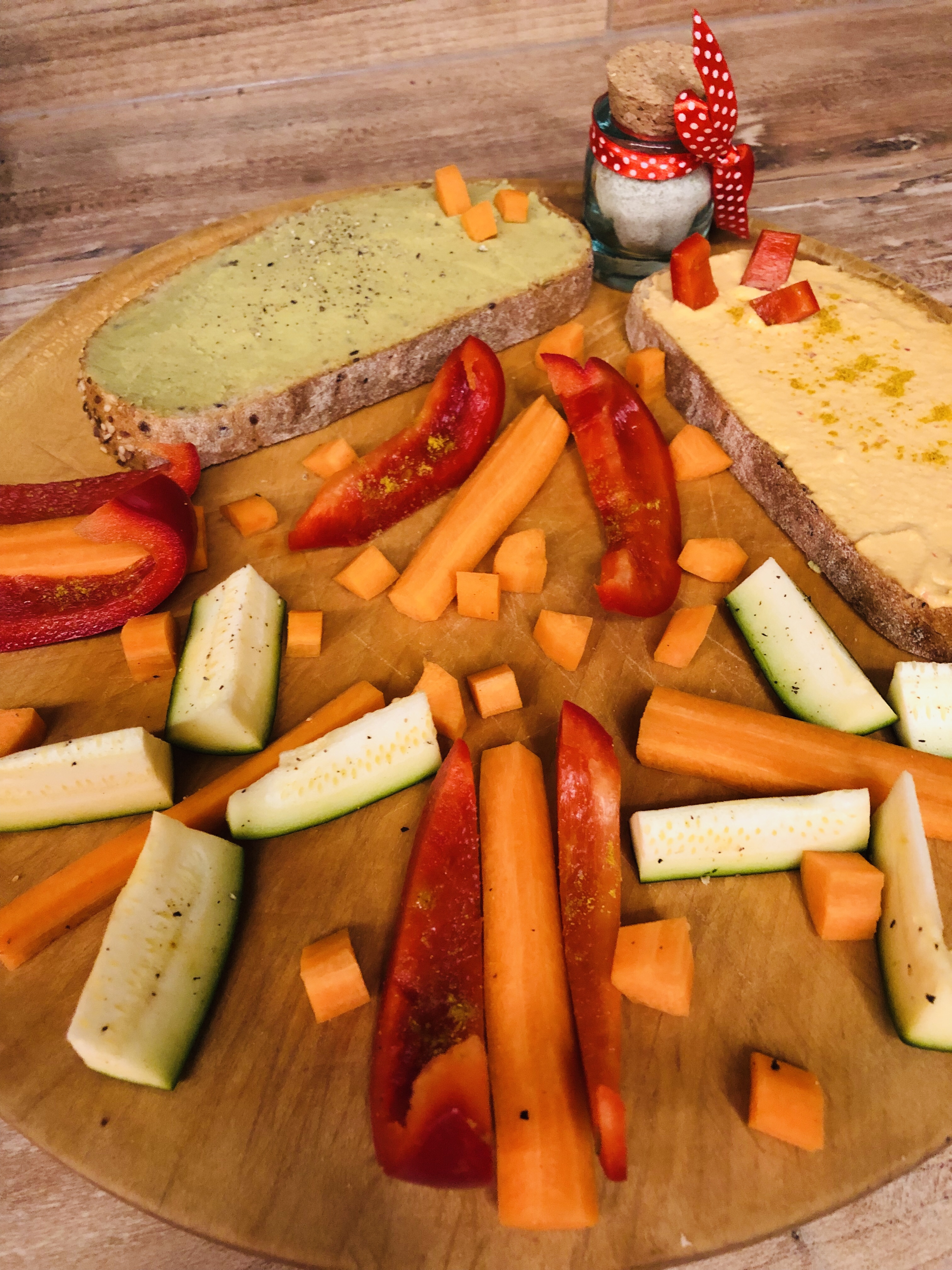 Abends bin ich nach meinem Chinesischkurs erst spät nach Hause gekommen, und so gab es nur kalte Küche. Dinkelbrot, einmal mit Hummus und einmal mit Margarine – dazu Gemüsehäppchen.
