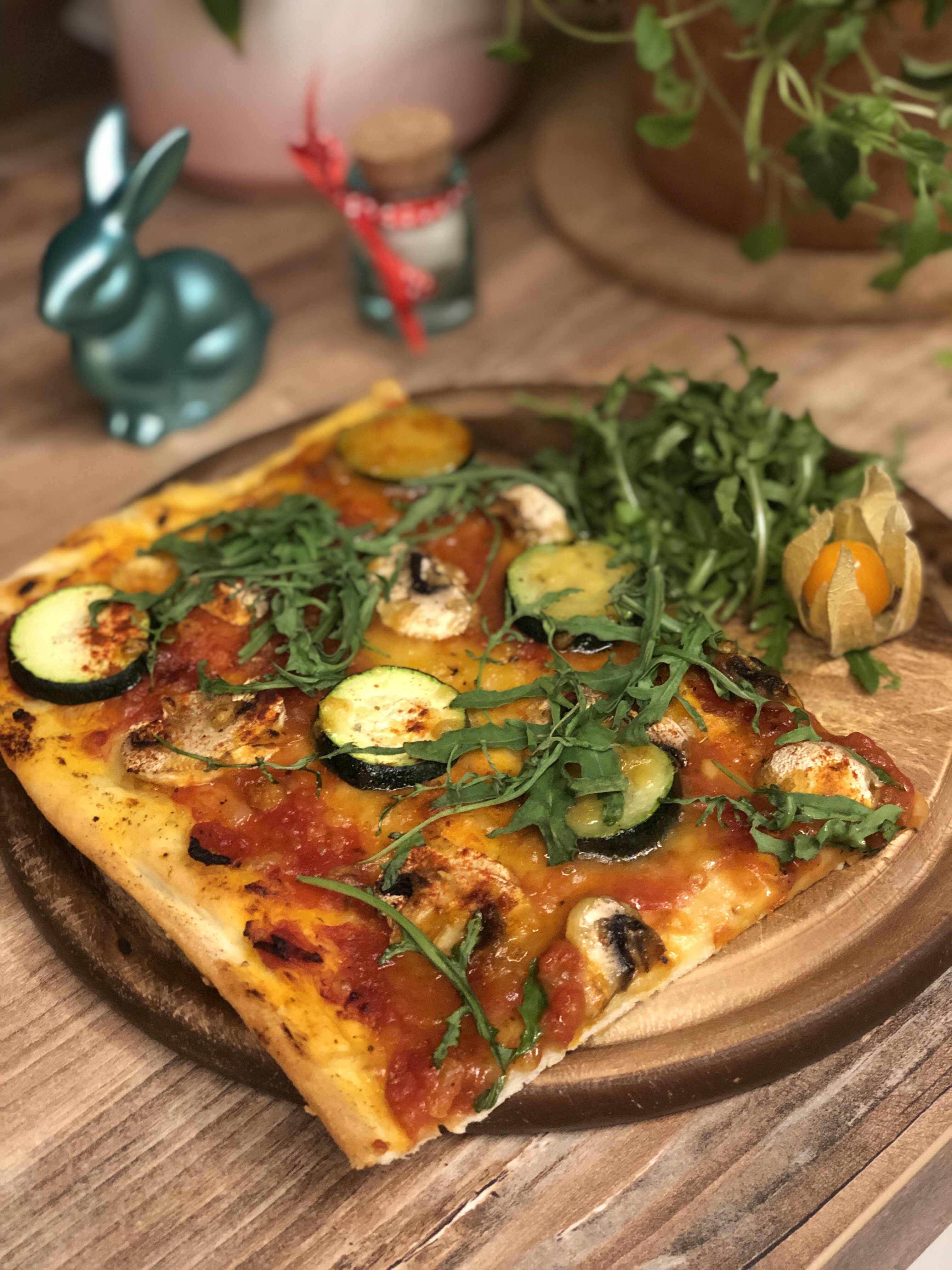 Abends, nach einer kleinen Joggingrunde, habe ich Pizza gemacht. Meinen Standard-Hefeteig, mit Zwiebeln und Knoblauch verfeinerte Tomatensoße, Champignons, Zucchini und Rucola als Belag und oben drüber ein bisschen was von dem veganen Reibekäse, den ich noch im Kühlschrank hatte. Alles schön gewürzt und so hat die Pizza fantastisch geschmeckt!