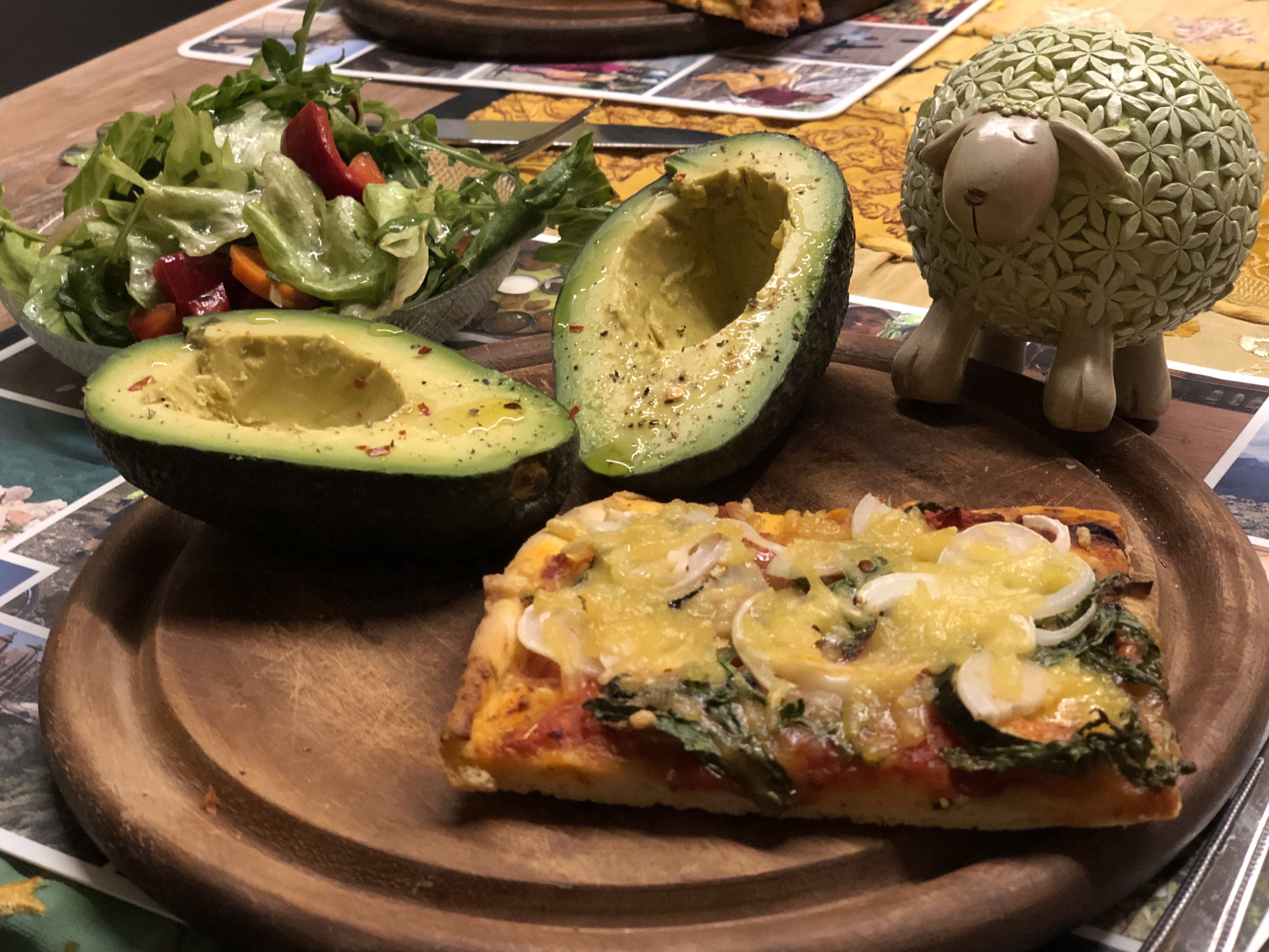 Zuhause gab’s die restliche Pizza von vorgestern, gemischten Salat und frische Avocado aus Ecuador. War auch sehr fein – und zu 100% vegan 😉.
