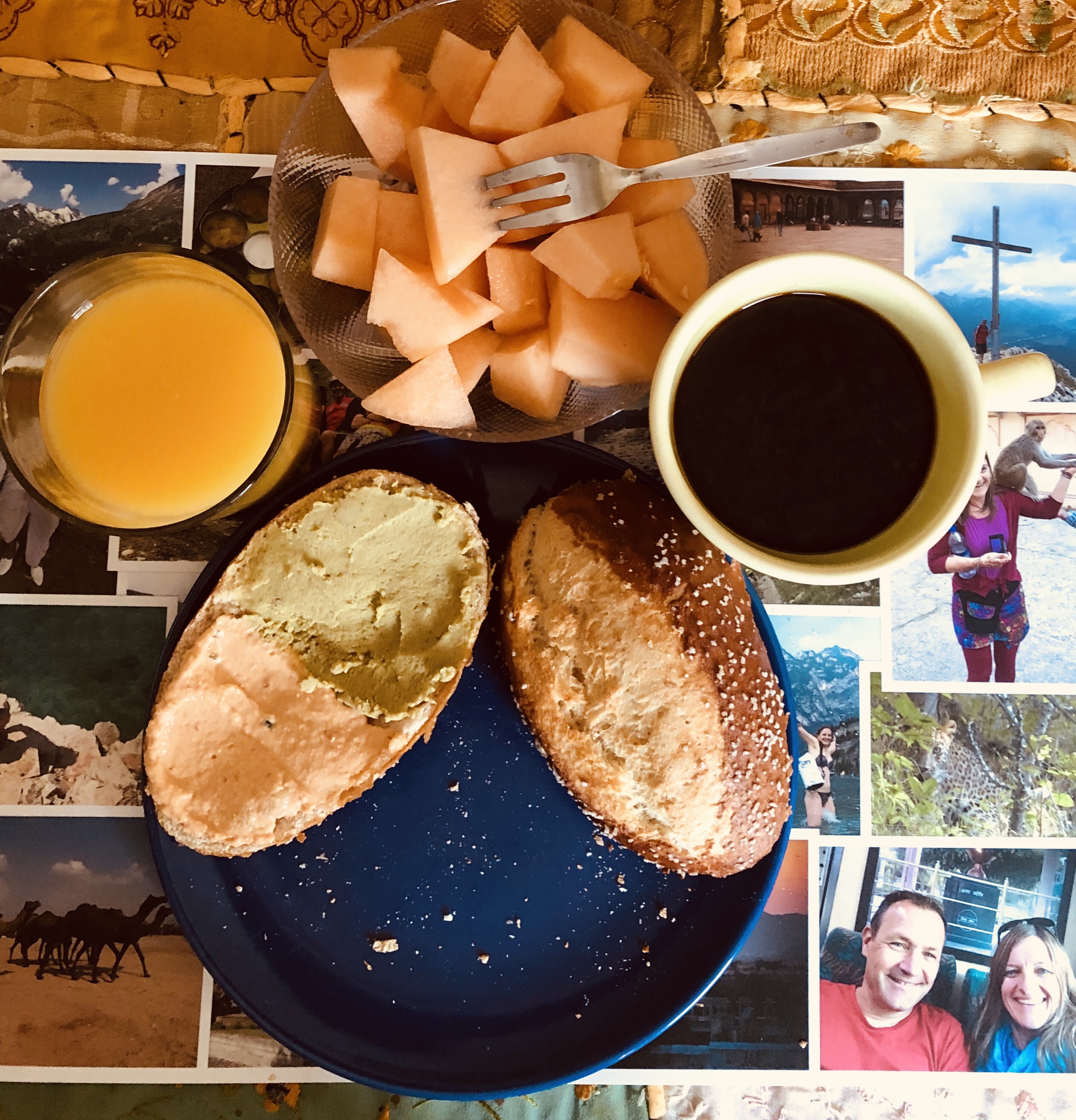 Schönes Karfreitagsfrühstück mit Melone, Brot und verschiedenen Aufstrichen gemacht.
