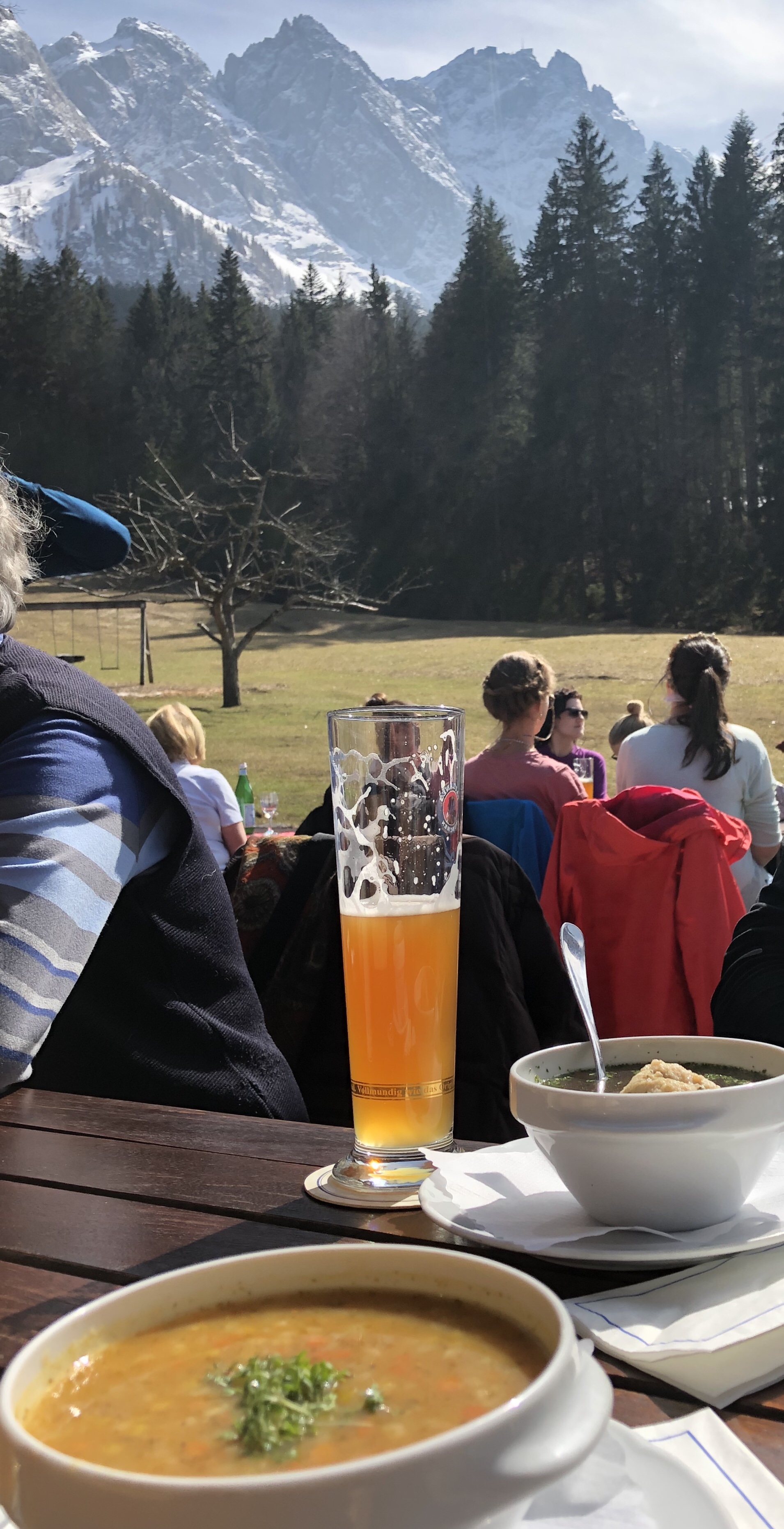 Auf der Eibsee-Alm mit Blick auf die Zugspitze haben wir Pause gemacht und wollten etwas auf der Sonnenterrasse essen. Auf der Karte stand so gut wie nichts Vegetarisches geschweige denn etwas Veganes. Immerhin gab es einen Gemüse-Kräuter-Eintopf. Diesen wollte ich ohne Ricotta bestellen – da meinte der slawisch klingende Keller: „Gerne auch ohne Geschmack!“ Und das leichte Weizen, das ich bestellt habe, kommentierte er mit „Ist genauso schwer wie das normale“. So ein lustiges Kerlchen 😉. Eintopf und Weizen war schließlich 1a und frisch gestärkt ging’s danach wieder nach Hause zurück.