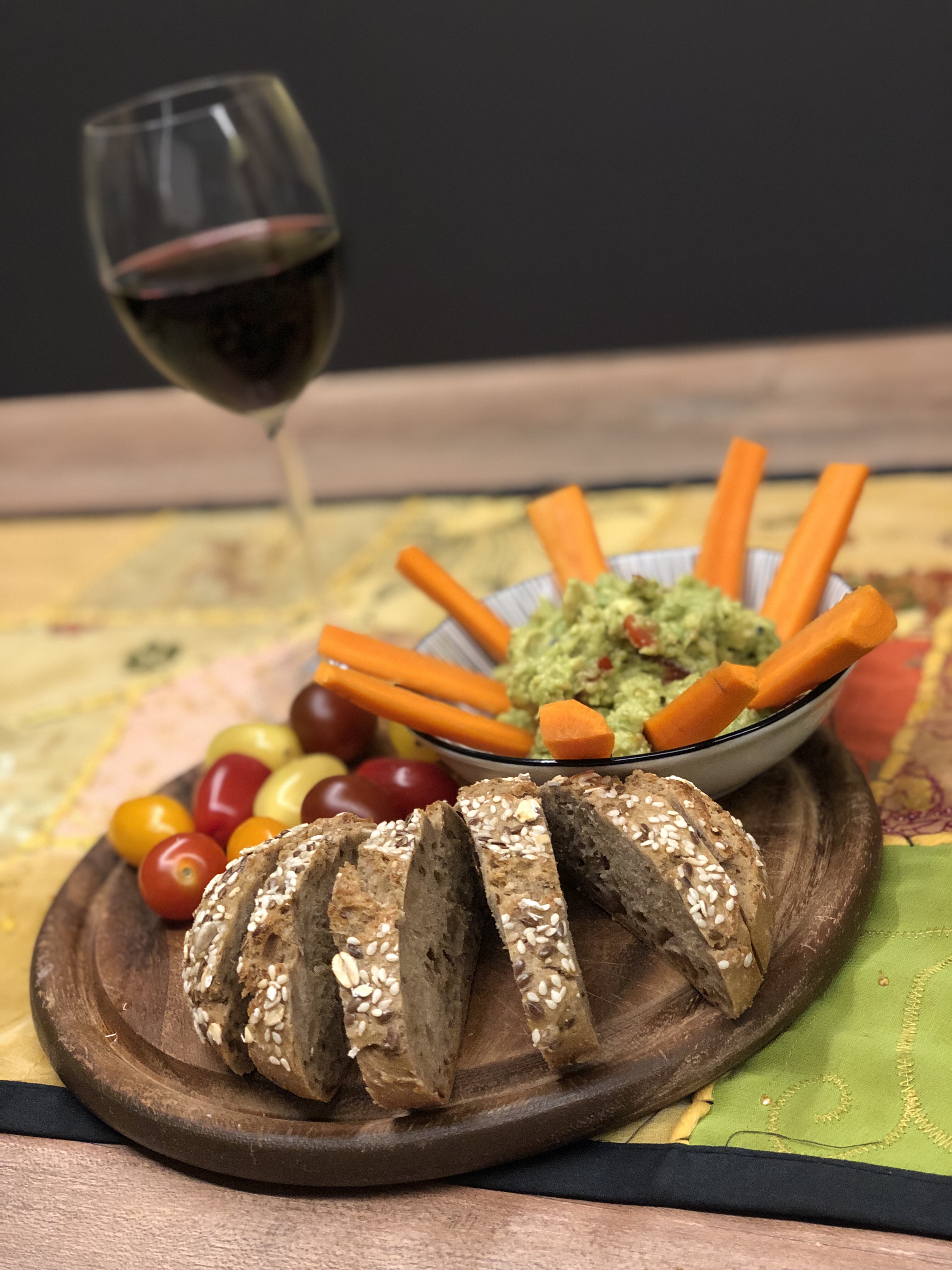 Abends hab ich frisches Gemüse eingekauft, eine feine Guacamole gebastelt und alles zusammen mit einem Vollkornbrötchen genossen (und mit einem Glas Feierabendwein).