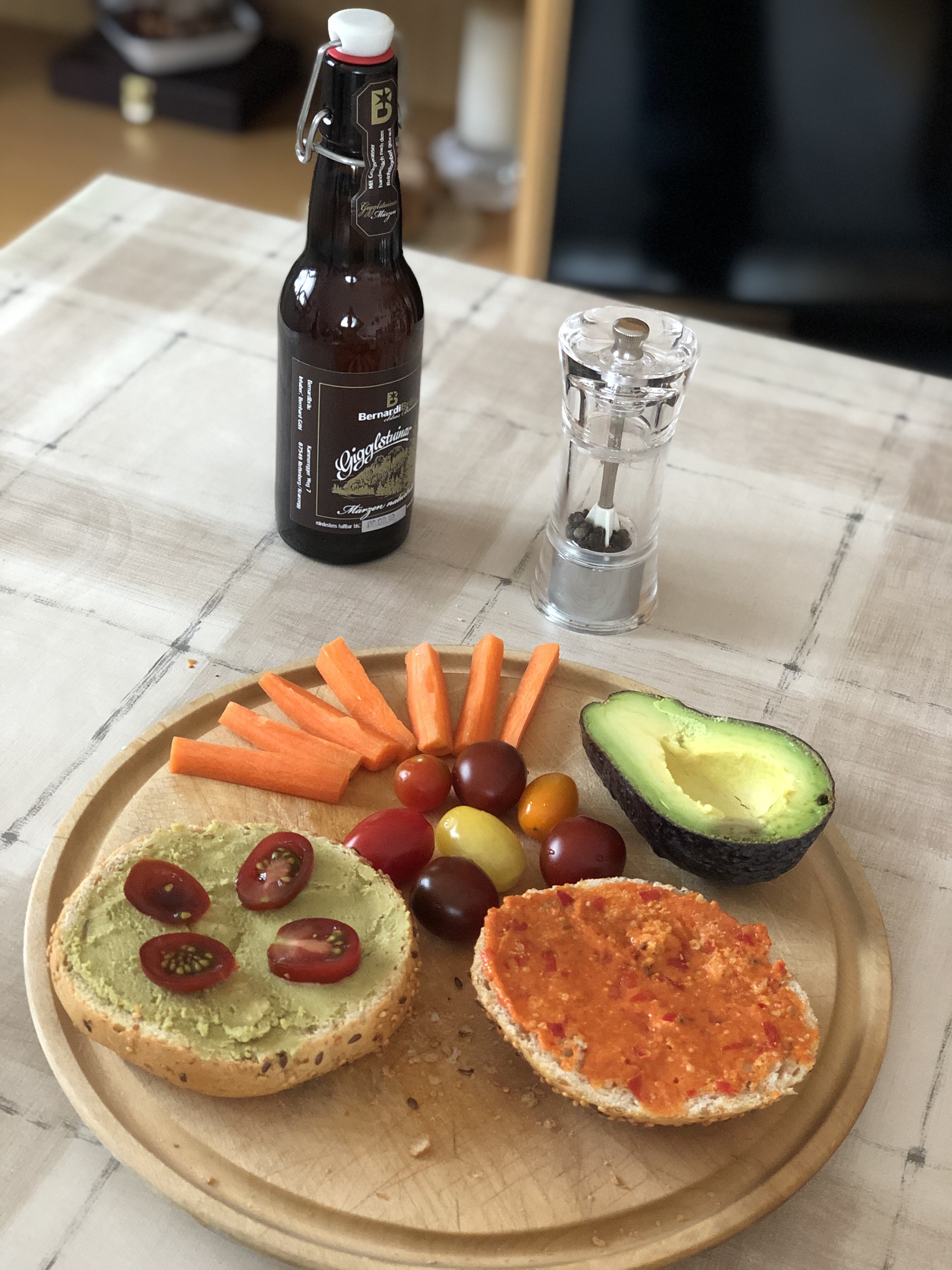 Deswegen hatte ich untertags keine Zeit etwas zu essen, hab mit aber dafür abends eine feine Brotzeit gerichtet. Sportlersemmel mit der restlichen Erbse-Masala Paste und Paprika-Nuss Aufstrich, dazu frisches Gemüse. Das Bier im Hintergrund war nur Deko 😊.