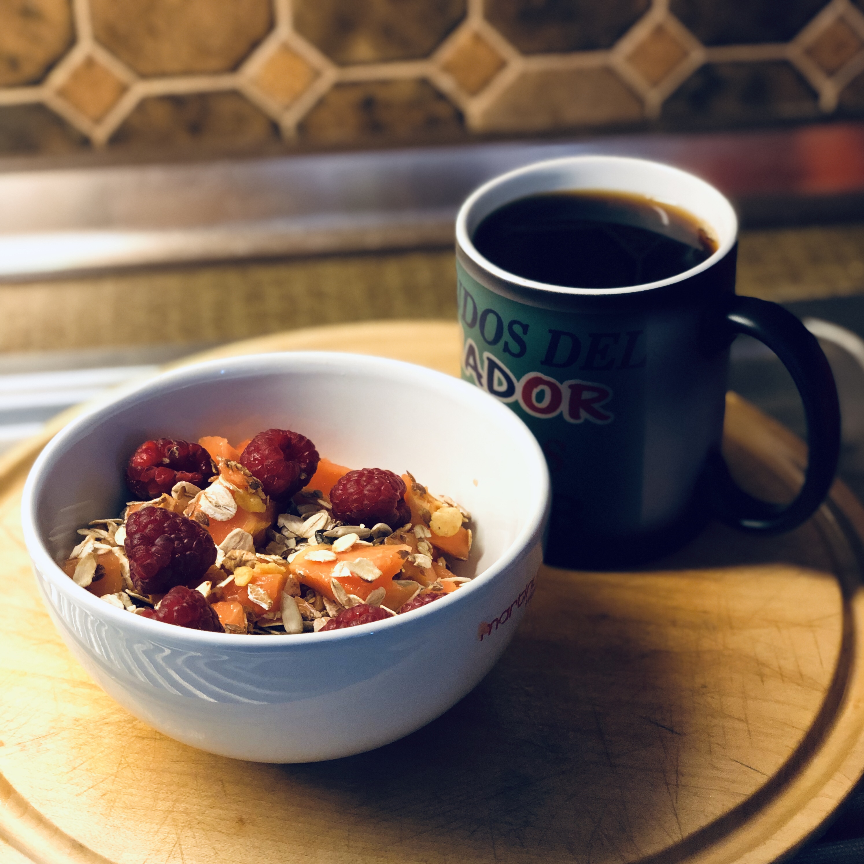 Heute gab’s Papaya und Himbeeren im Müsli mit Haferdrink – eine sehr harmonische Mischung, wie ich finde.