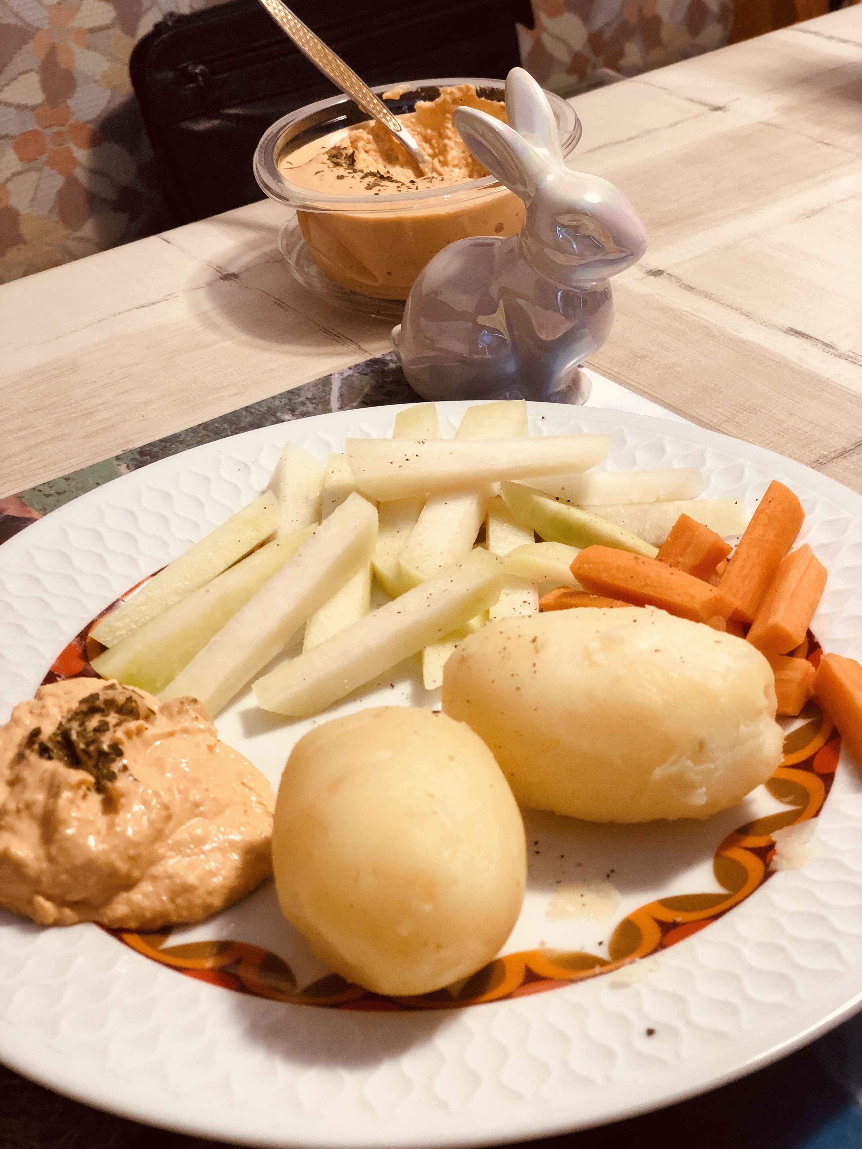 Und zu Mittag samtweiche Pellkartoffeln mit Chili Hummus, frischen Karotten und Kohlrabi. Auch eine sehr gute Alternative zu Kartoffeln mit Butter, Käse und Quark.
