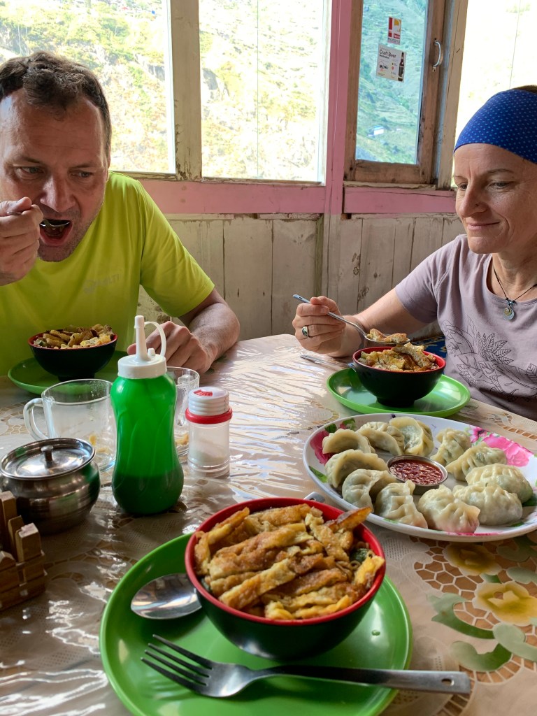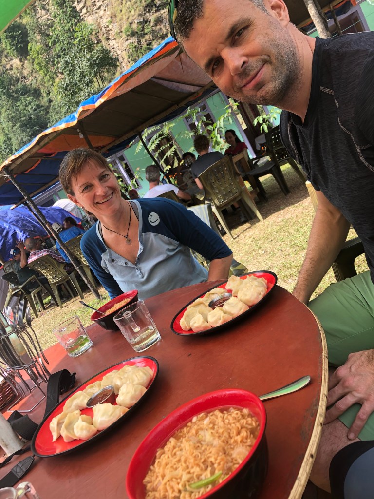 Mittagessen ist wieder super! Vegetarische Nudelsuppe mit Ei und Momos. Das brauchen wir auch dringend zur Stärkung!