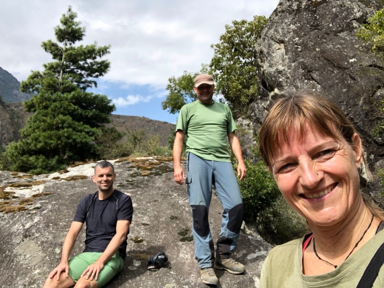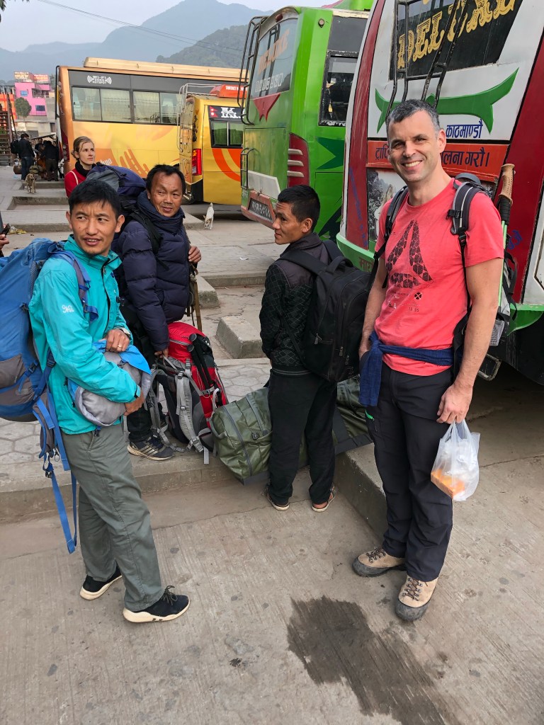 Frühstück To-Go und los geht’s um 6:15 Uhr zum Busbahnhof. Dort treffen wir unseren Guide Ang Kami Sherpa und die Träger Karma Sherpa und Mimchiri Sherpa – zwei ganz liebe, aber winzige (und sicher zähe) Kerlchen.