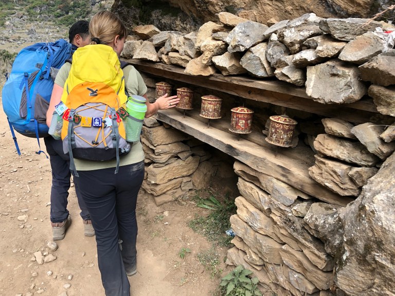Wir laufen oberhalb des Flusses weiter, an alten Gebetsmühlen und Mani-Denkmälern aus tibetischen Steintafeln vorbei.
