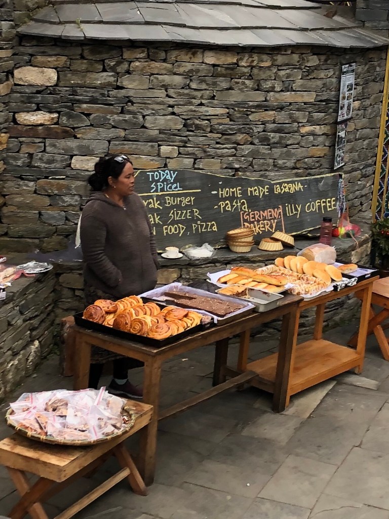 Als wir schließlich nach durchaus abenteuerlicher, da abschüssiger Wanderung auf sandigen Pfaden oberhalb des Flusses Namrung auf 2630 m erreichen, werden wir von einer Dame der German Bakery mit leckeren Backwaren empfangen.