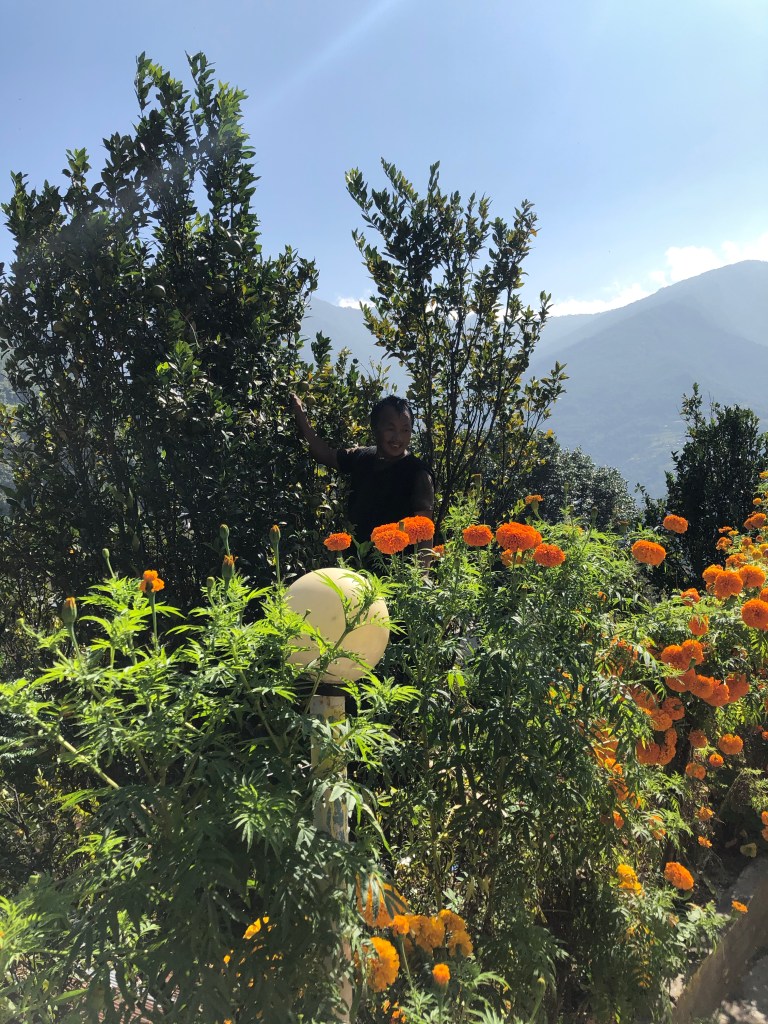 Außerdem springt Karma, unser Träger, wagemutig in den Orangenbaum, um Früchte für uns zu pflücken.