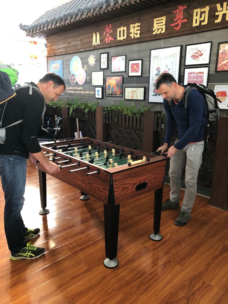 Wir frühstücken (chinesische Teigtaschensuppe), ruhen uns auf komfortablen Liegen im Transitbereich aus und wundern uns über einen Tischkicker mit drei Torwarten!