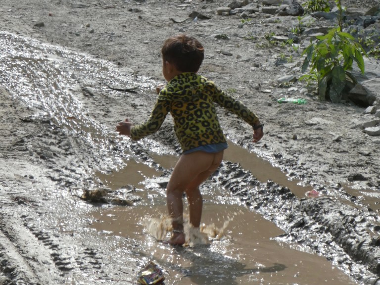 Bei so mancher Flussüberquerung versuche ich nicht ins Wasser zu fallen, während die Kleinen mit Freude in den Pfützen plantschen.