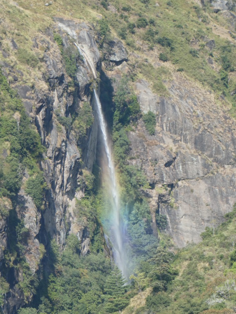 Dann zweigen wir über den Fluss ab und laufen wieder an spektakulären Felsformationen (mit Bienenstöcken), feuchten, moosbewachsenen Hängen und gigantischen Wasserfällen vorbei. Die Vegetation wird immer grüner.